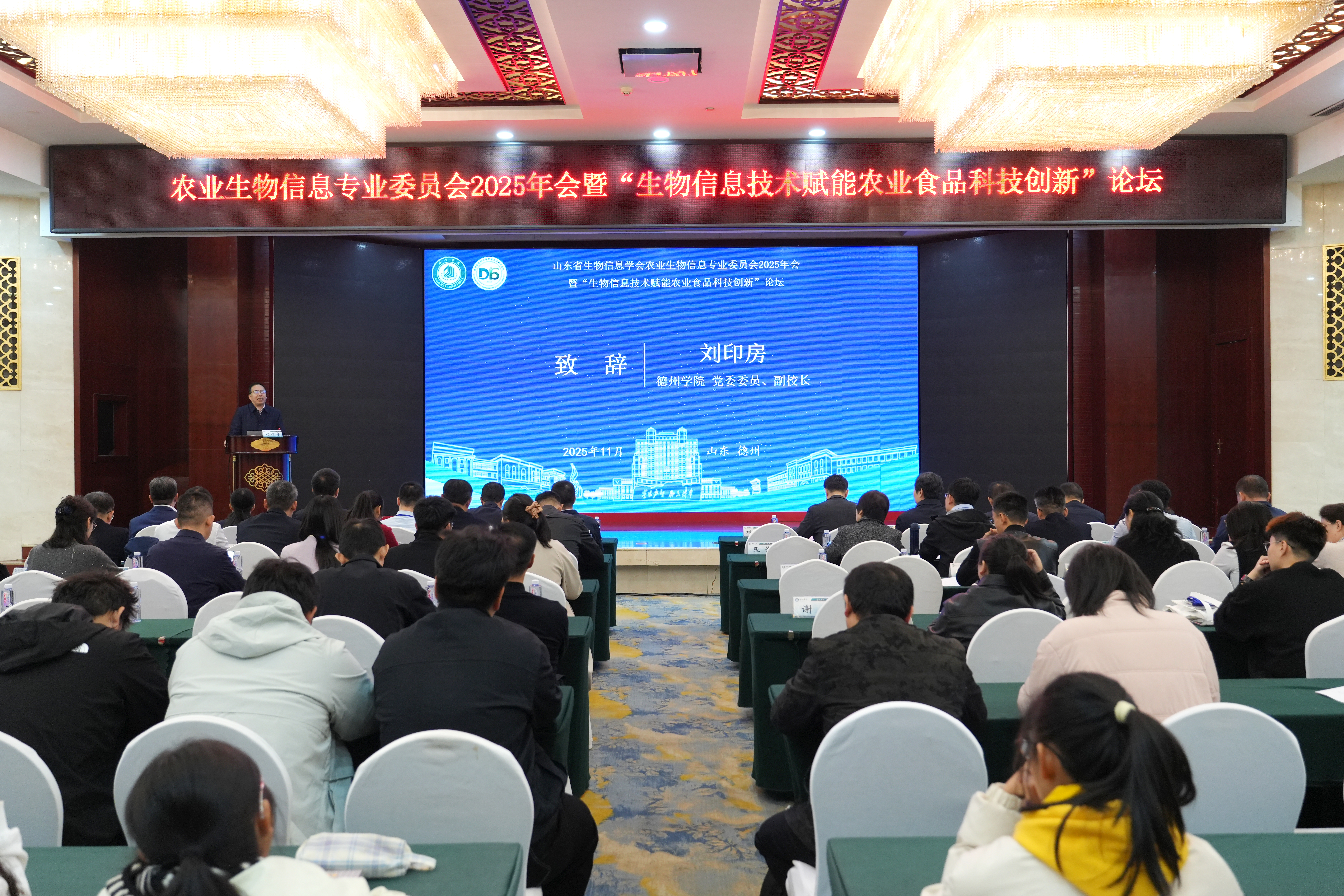 党委委员、副校长刘印房、山东省生物信息学会秘书长于彬、德州市市场监督管理局副局长闫洪卫、德州市科协副主席夏祥涛出席并致辞,山东省生物信息学会农业生物信息专业委员会主任于家峰主持开幕式。来自省内外高校院所的60余位专家学者、企业家围绕食品产业技术发展及畜禽绿色高效养殖前沿进展进行交流探讨,介绍了计算化学、人工智能、无人机遥感、生物信息学与宏基因组学等前沿技术在食品产业和畜禽绿色养殖中的应用。