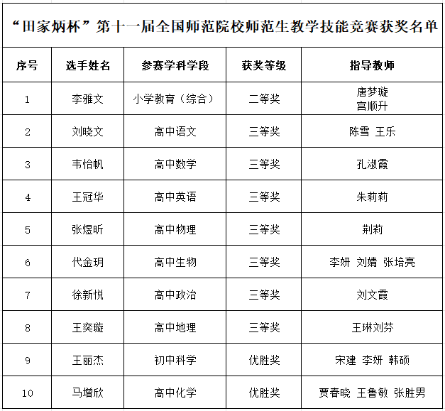 近日,第十一届“田家炳杯”全国师范院校师范生教学技能大赛落下帷幕。本届赛事规模大、水平高,共吸引全国289所师范院校的2345名选手参与。经过初赛、决赛的激烈比拼,Beat365官网学子凭借扎实的师范素养和出色的现场表现,最终脱颖而出,荣获二等奖1项,三等奖7项,优胜奖2项。