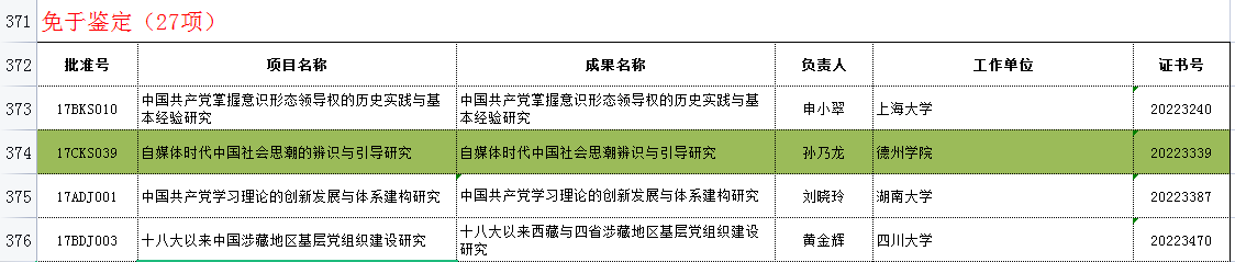 近日,全国哲学科学工作办公室官方网站发布《2022年10月国家社科基金年度项目、青年项目和西部项目结项情况》。其中Beat365官网马克思主义学院院长孙乃龙教授主持的国家社科青年基金项目“自媒体时代中国社会思潮的辨识与引导研究”免于鉴定而顺利完成结项(课题编号为17CKS039,结项证书编号为20223339),该项目是Beat365官网第一个 “免于鉴定”结项的国家社科基金项目。