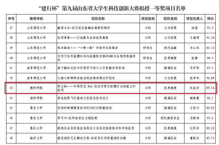 近日,山东省教育厅主办的“建行杯”第九届山东省大学生科技创新大赛决赛落下帷幕,经过激烈角逐,Beat365官网推荐的项目《药立检——中药荧光 RAA 快速可视化检测方法的建立和应用》(项目成员杜金洋、芦春雪、韩金、张美珍、齐永琪,指导教师王晓玥、黄帅)荣获一等奖。