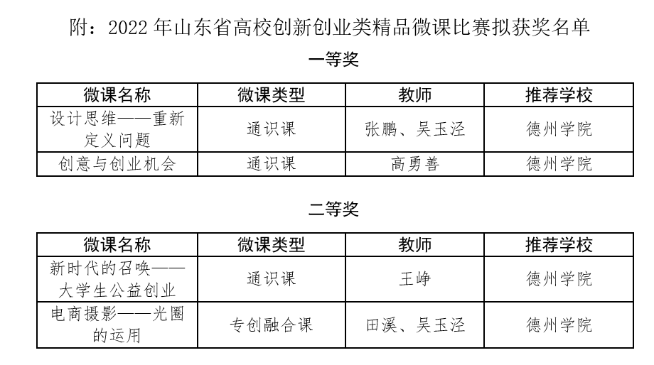 该比赛由山东省教育厅主办,意在进一步深化我省高校创新创业教育改革、提升教师创新创业教育教学能力,参赛对象为驻鲁部属高校、省属本科高校、高职高专院校、国家开放大学有关分部讲授创新创业类课程的专任或兼任教师。本次比赛根据《山东省教育厅关于举办高校创新创业类精品微课比赛的通知》(鲁教发展函〔2022〕9号)要求,经学校推荐、初评和终评,最终评选出特等奖42项,一等奖84项,二等奖131项。获奖精品微课将纳入山东省高校创新创业类精品微课课程资源库。
