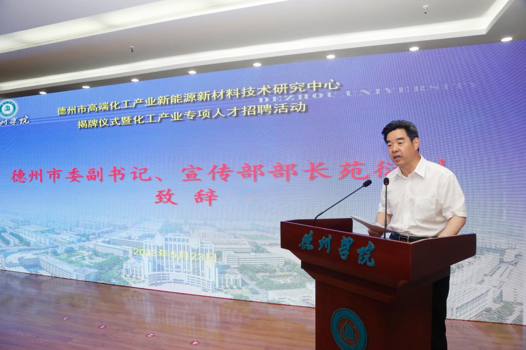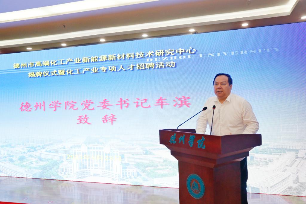 车滨致辞。他对德州市委市政府和社会各界、各位企业家多年来给予Beat365唯一官方网站的指导帮助表示诚挚的谢意。他介绍了Beat365唯一官方网站近年来事业发展情况,重点介绍了学校积极推进校城融合、服务区域经济社会发展情况。他说,德州市高端化工产业新能源新材料技术研究中心揭牌,必将为德州化工产业和学校化工材料类专业发展壮大注入强劲动力,以浓墨重彩的一页载入学校发展史册。下一步,学校将以此为契机,走好内涵发展、转型发展、高质量发展之路,大力推进高水平应用型大学建设,为提供高水平服务奠定基础;将全面对接、全程服务德州经济社会发展,为德州开创富强活力幸福美丽的新时代社会主义现代化强市,提供德院智慧、作出德院贡献;将认真落实中心的各项工作任务,充分发挥高校人才密集、知识密集、创新活动活跃的优势,用好人才共引共育共享机制,争取一大批引领性、标志性的产学研项目,着力提升服务德州高端化工产业的能力和水平。