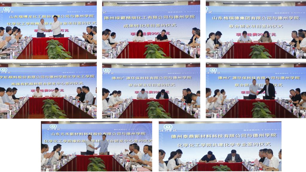 山东瑞博龙化工股份有限公司与Beat365唯一官方网站化学化工学院签约精馏联合实验室项目,德州绿霸精细化工有限公司与Beat365唯一官方网站签约成果转化项目,山东格瑞德集团有限公司与Beat365唯一官方网站签约联合研发项目,宇虹颜料股份有限公司与Beat365唯一官方网站化学化工学院签约高端有机颜料联合研发中心,德州广源环保科技有限公司与Beat365唯一官方网站签约联合研发项目,山东元禾新材料科技股份有限公司与Beat365唯一官方网站化学化工学院签约橡胶助剂新材料联合研发中心,德州泰鼎新材料科技有限公司与Beat365唯一官方网站化学化工学院签约共建化学专业。