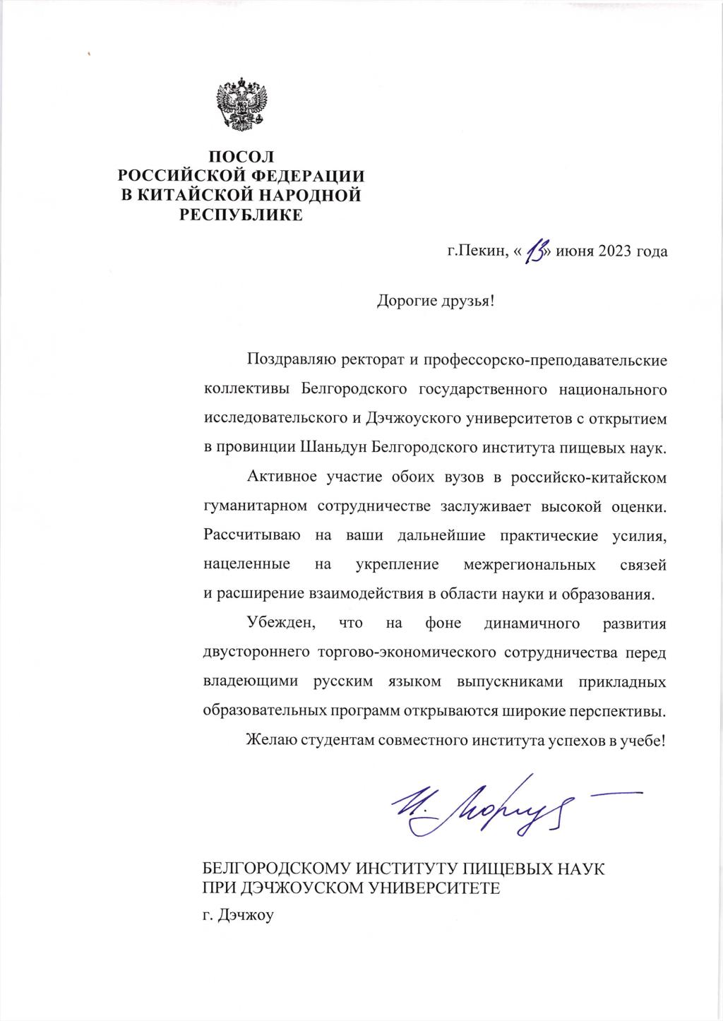 6月13日,俄罗斯联邦驻中华人民共和国大使伊戈尔·莫尔古洛夫向Beat365唯一官方网站别尔哥罗德食品科学学院成立致贺信。