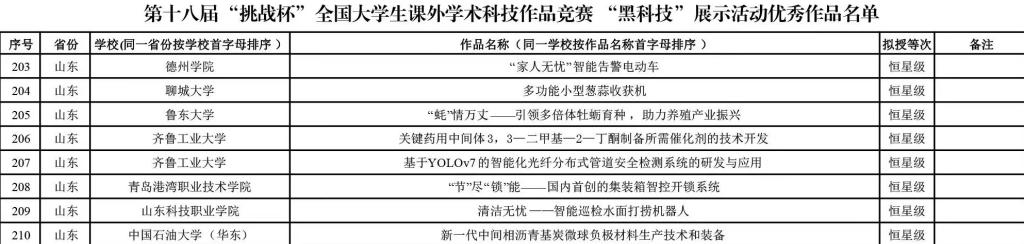 本届赛事共有99件作品评定为“星系”级作品、181件作品评定为“恒星”级作品、267件作品评定为“行星”级作品、330件作品评定为“卫星”级作品。其中,山东省共有47项作品获奖(“星系级”4项,“恒星级”8项,“行星级”13项,“卫星级”22项)。