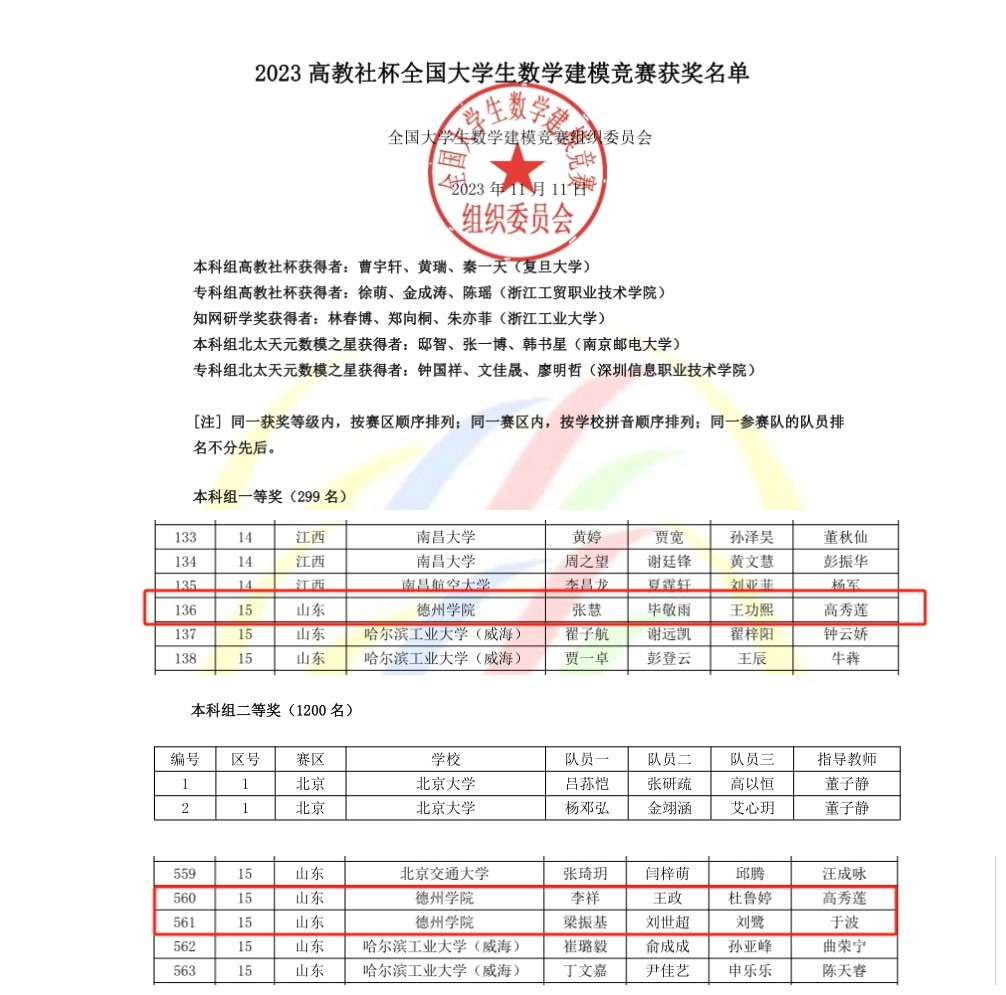 近日,全国大学生数学建模竞赛获奖名单揭晓,学校25支队伍获奖。其中,获得国家一等奖1项,二等奖2项;省级一等奖5项、二等奖10项、三等奖7项。获奖率达67.57%,超省平均水平19.2个百分点,名列省内同类院校首位。