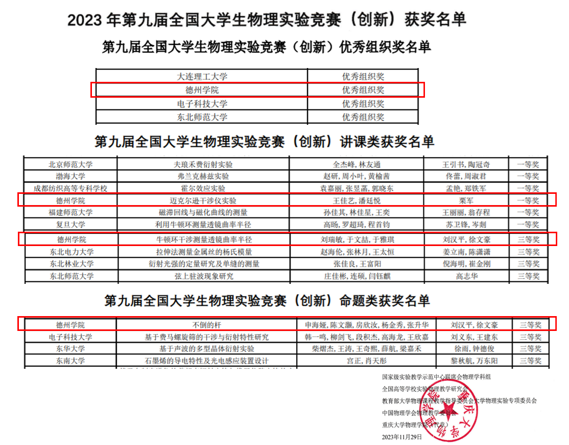 近日,全国第九届大学生物理实验竞赛落下帷幕,Beat365官网学子取得优异成绩。获得国家一等奖1项、三等奖2项。Beat365唯一官方网站荣获优秀组织单位,在全省高校中位于前列。