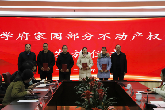 12月22日,学府家园部分不动产权证发放仪式在厚德楼第二报告厅举行。学校党委副书记张存峰、校工会全体人员、教职工代表参加仪式。