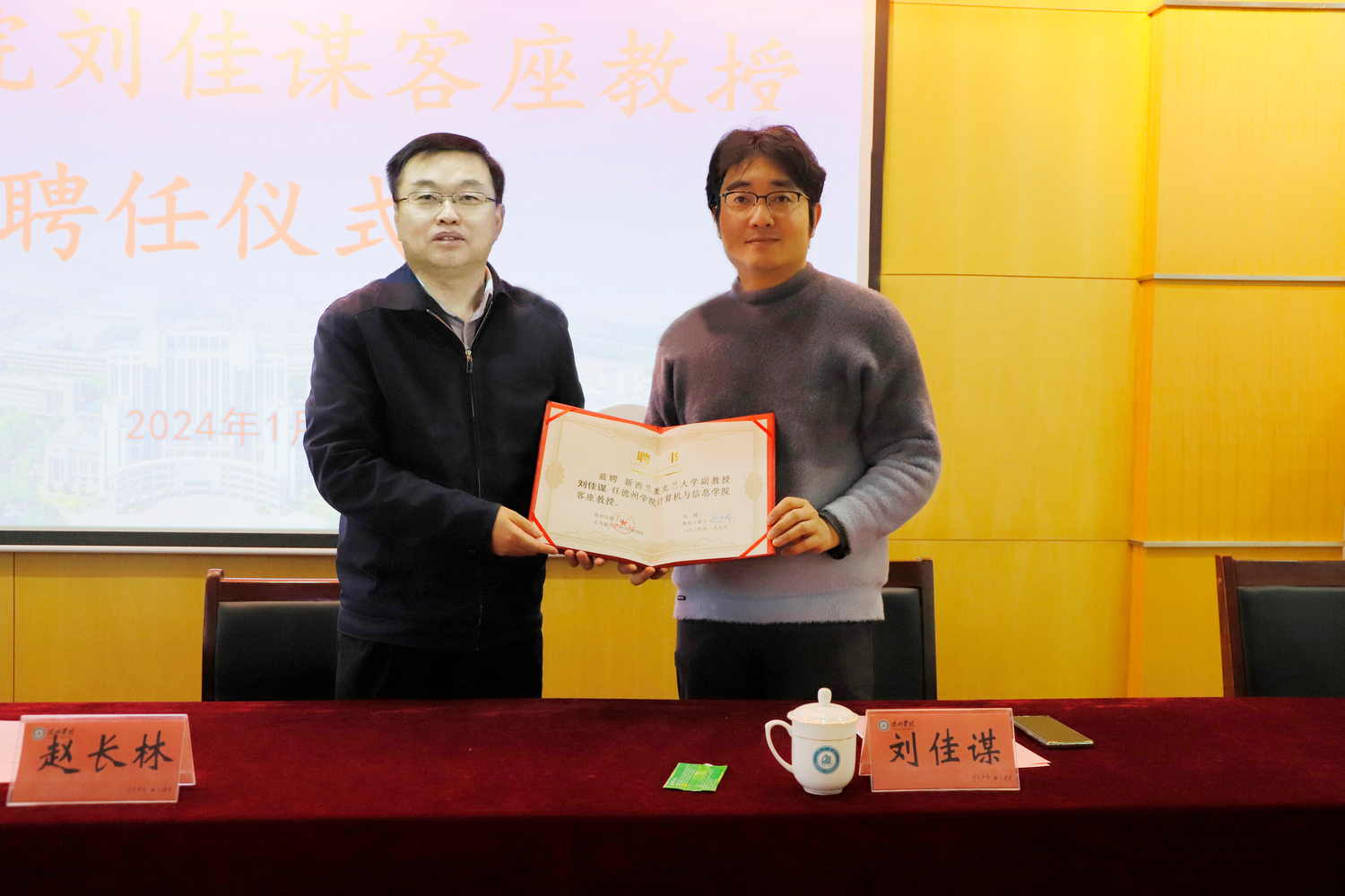 1月5日上午,新西兰奥克兰大学刘佳谋博士应邀来校开展学术讲座,并被聘任为Beat365唯一官方网站客座教授。校党委副书记、校长赵长林为刘佳谋博士颁发聘书,人事处负责人、计算机与信息学院班子成员及部分师生代表参加客座教授聘任仪式。