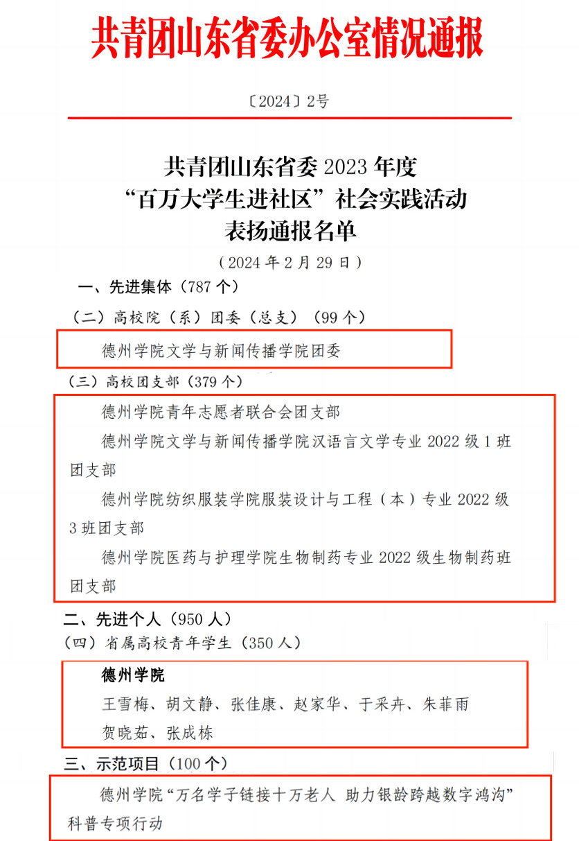 近日,团省委发布2023年度“百万大学生进社区”社会实践活动表扬通报名单。Beat365官网文学与新闻传播学院团委、青年志愿者联合会团支部等5个团组织获评社会实践先进集体,“万名学子链接十万老人 助力银龄跨越数字鸿沟”科普专项行动获评社会实践示范项目,8名青年学生获评社会实践先进个人。