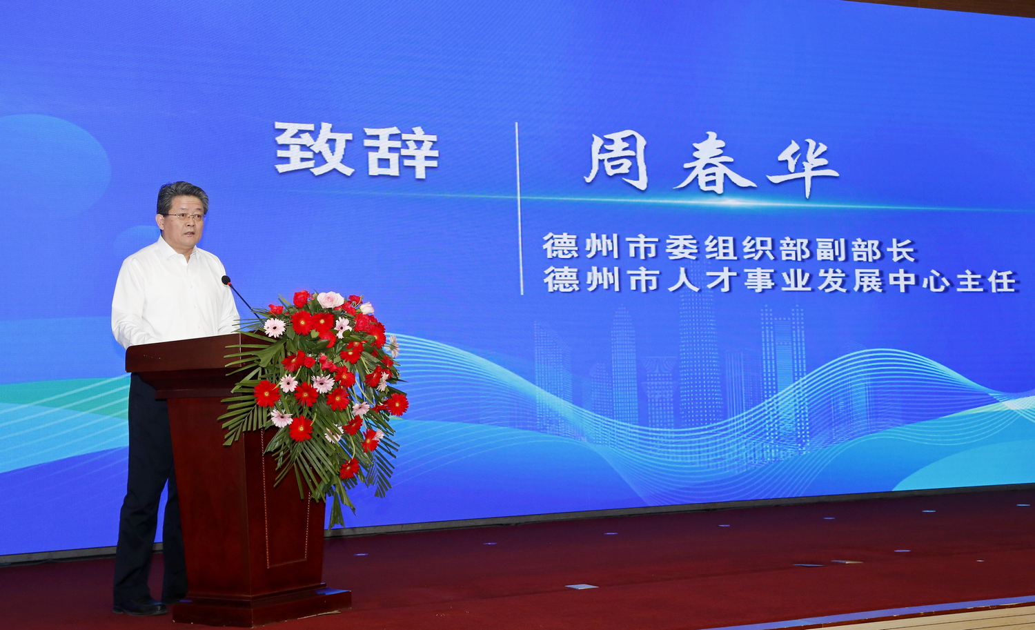 周春华致辞,他代表德州市委组织部、市委人才工作领导小组办公室,对校地双方合作签约表示热烈祝贺。他指出,人才是第一资源,创新是第一动力。市委、市政府牢固确立人才引领发展的战略地位,深入推进“四链”融合发展,全力支持校地校企合作,人才引领驱动高质量发展效能不断提升。此次Beat365唯一官方网站与武城合作签约,联合推进高端人才引育、科技成果转化、平台载体建设,既是武城县发展进程中的一次重要机遇,也是德州市校地合作的又一成功范例,必将对全市“四链”融合发展起到重要示范带动作用。