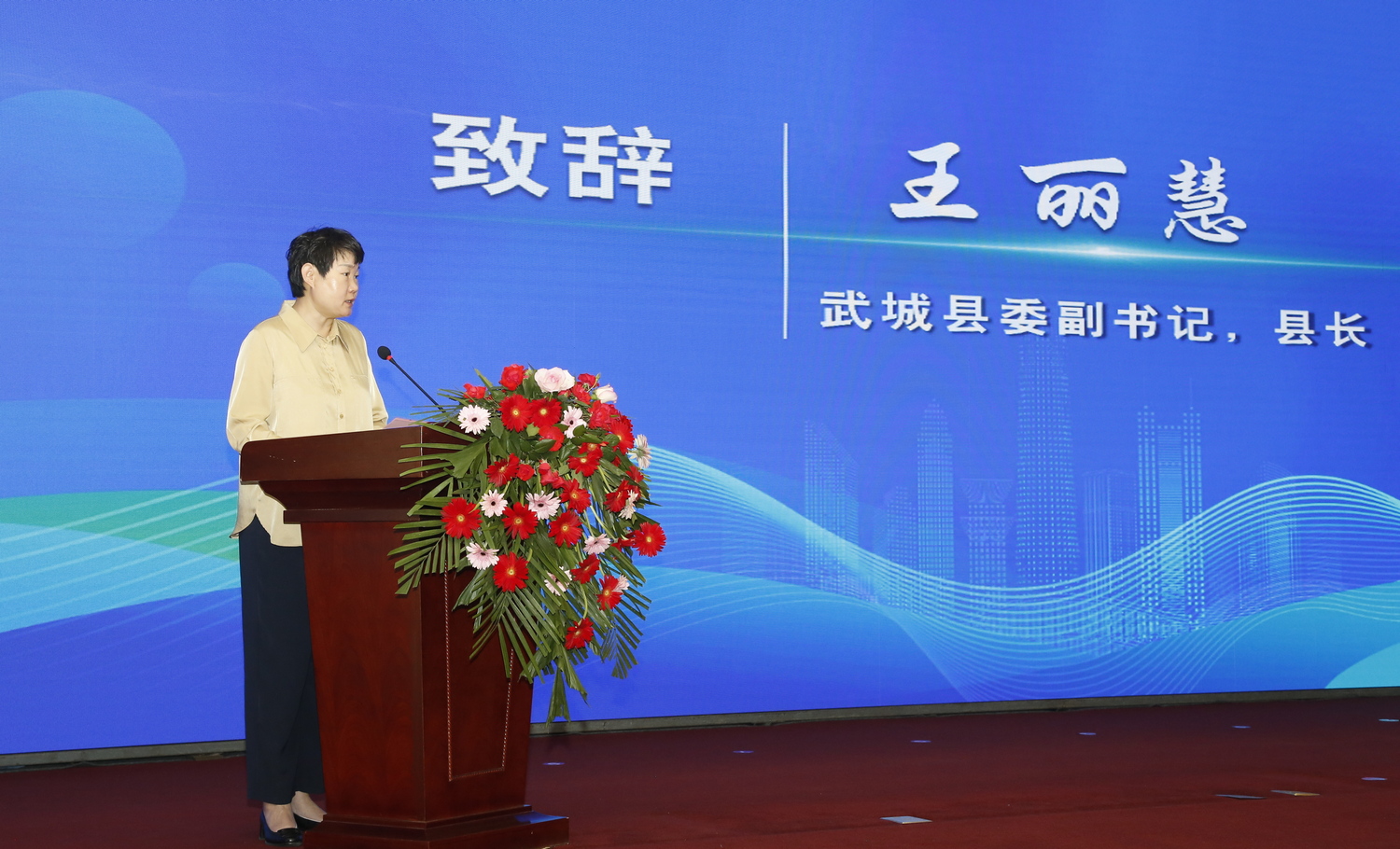 王丽慧致辞,她对各位来宾的到来表示衷心感谢,介绍了武城县经济社会发展情况及产业特色。她指出,武城县围绕“四链”融合发展,持续推动科技创新和产业创新深度融合,积极构建“政府+企业+高校”合作体系。本次签约是进一步探索“校地企”合作模式的有效路径,必将有力推动在高层次人才、科技创新、成果转化等方面的共建共享、同频共振。武城县将以此次签约为契机,把地方发展之长与高校建设之需紧密结合,进一步深化校地合作、加强校企共建,共同推动战略合作迈向更高层次、更宽领域。