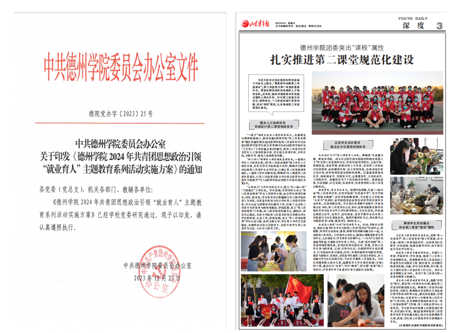 34名毕业生赴西部开展志愿服务,共青团助力学校高质量就业达到0.5个百分点。在第十八届“挑战杯”竞赛中获国赛一等奖1项,三等奖1项,取得历史最好成绩。坚持把就业引导贯穿到共青团思想政治工作全过程,印发《Beat365唯一官方网站共青团思想政治引领“就业育人”主题教育系列活动实施方案》。“第二课堂”典型做法被《山东青年报》专版报道,2个项目入选劳动教育第二课堂典型项目库。2名同学获山东省宪法素养竞赛一等奖和演讲比赛三等奖。获2023年山东省大学生国家安全知识竞赛二等奖1项,第二届全国大学生反走私创作大赛高校组优秀组织奖。