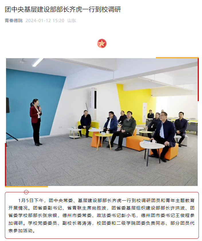 扎实开展团员和青年主题教育,建立团学骨干带头学、组织化集中学、主题团日常态学、交流研讨深入学,创新载体灵活学和N项社会实践学习活动相结合的“5+N”学习体系。持续开展“信仰公开课”“我的大学我的团”“青马工程”等共青团特色思政品牌项目。获批山东省高校共青团深化推优入党工作试点单位,9部作品在全省“我与党的二十大”课程思政短视频大赛中获奖,2件提案获2023年山东省青少年模拟政协提案大学组优秀提案,1名学生获“中国大学生自强之星”,1名团干部入选山东省高校党的二十大精神宣讲团成员。