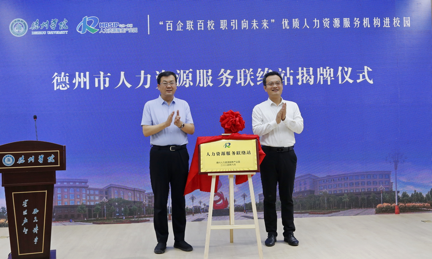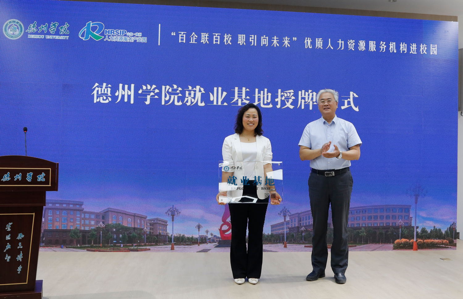 活动中,蒋涛涛、尚键共同为“人力资源服务联络站”揭牌。学校就业指导处负责人向德州人力资源服务产业园负责人授予“大学生就业实习基地”牌匾。
