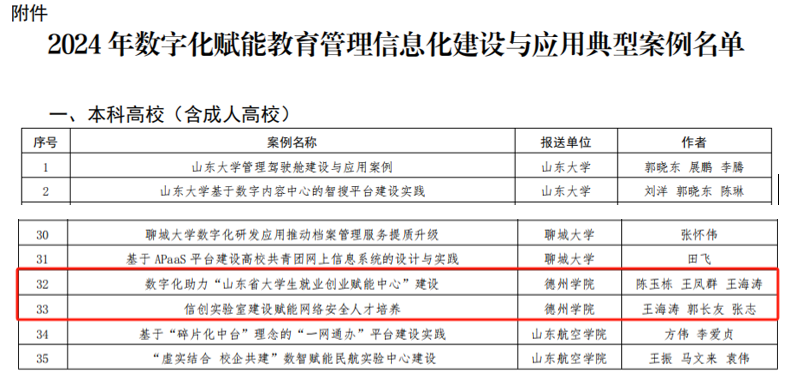 近日,山东省教育厅公布了 2024 年数字化赋能教育管理信息化建设与应用典型案例评选结果,Beat365官网申报的“数字化助力山东省大学生就业创业赋能中心建设”和“信创实验室建设赋能网络安全人才培养”两项案例位列其中。
