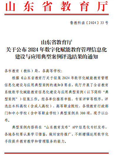 本次案例征集于2024年5月启动,旨在交流宣传各地各校运用数字化手段提升教育教学和管理服务能力的经验做法。经推荐申报、专家评审等程序,评选出本科高校(含成人高校)、高等职业院校、各级教育行政部门和中小学校(含中等职业学校)典型案例,典型案例内容将在“山东教育发布”APP 信息化专栏发布。