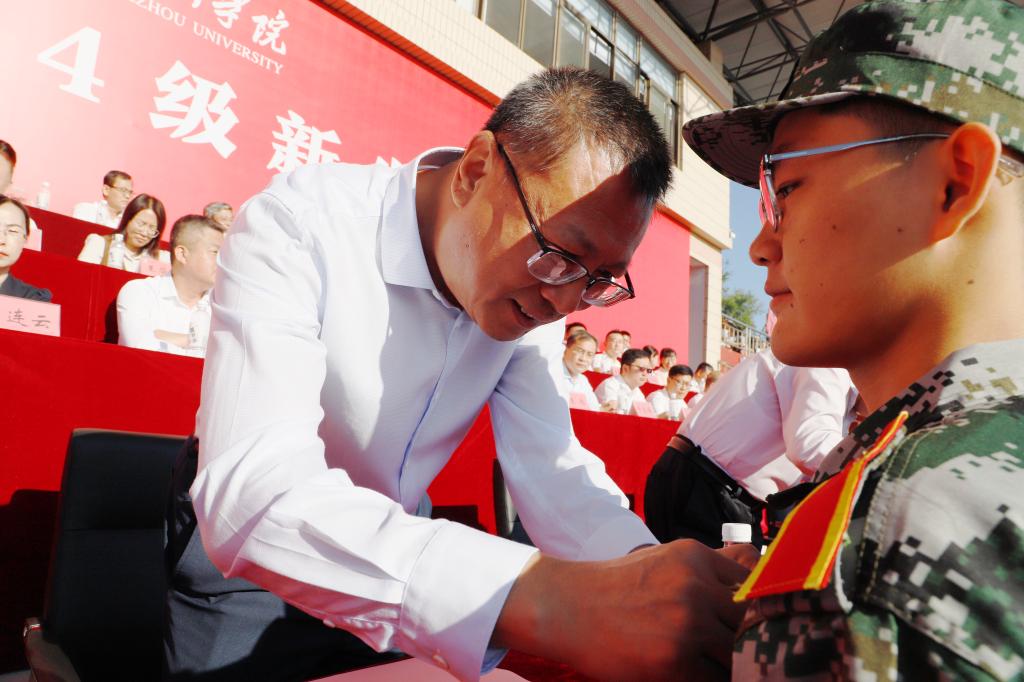 典礼上举行了新生佩戴校徽仪式,全体校领导为新生代表佩戴校徽。校徽承载着德院人的初心使命,饱含着全校师生的美好祝福与殷切期望。胸前闪耀的校徽,期待每一位2024级新生将“艰苦奋斗、自强不息”的德院精神赓续传承,从“崇德启智、励志博学”的校训起步,汇聚成强国复兴有我的青春奋斗乐章。