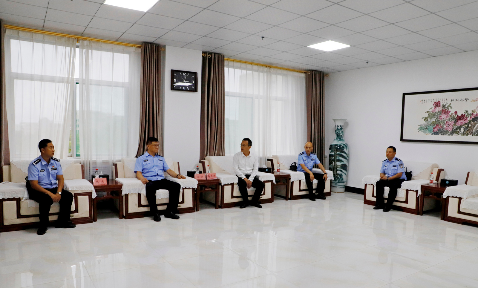 蒋涛涛与王强等警务人员一行在会客厅就高校反恐反邪教工作情况展开深入交流。