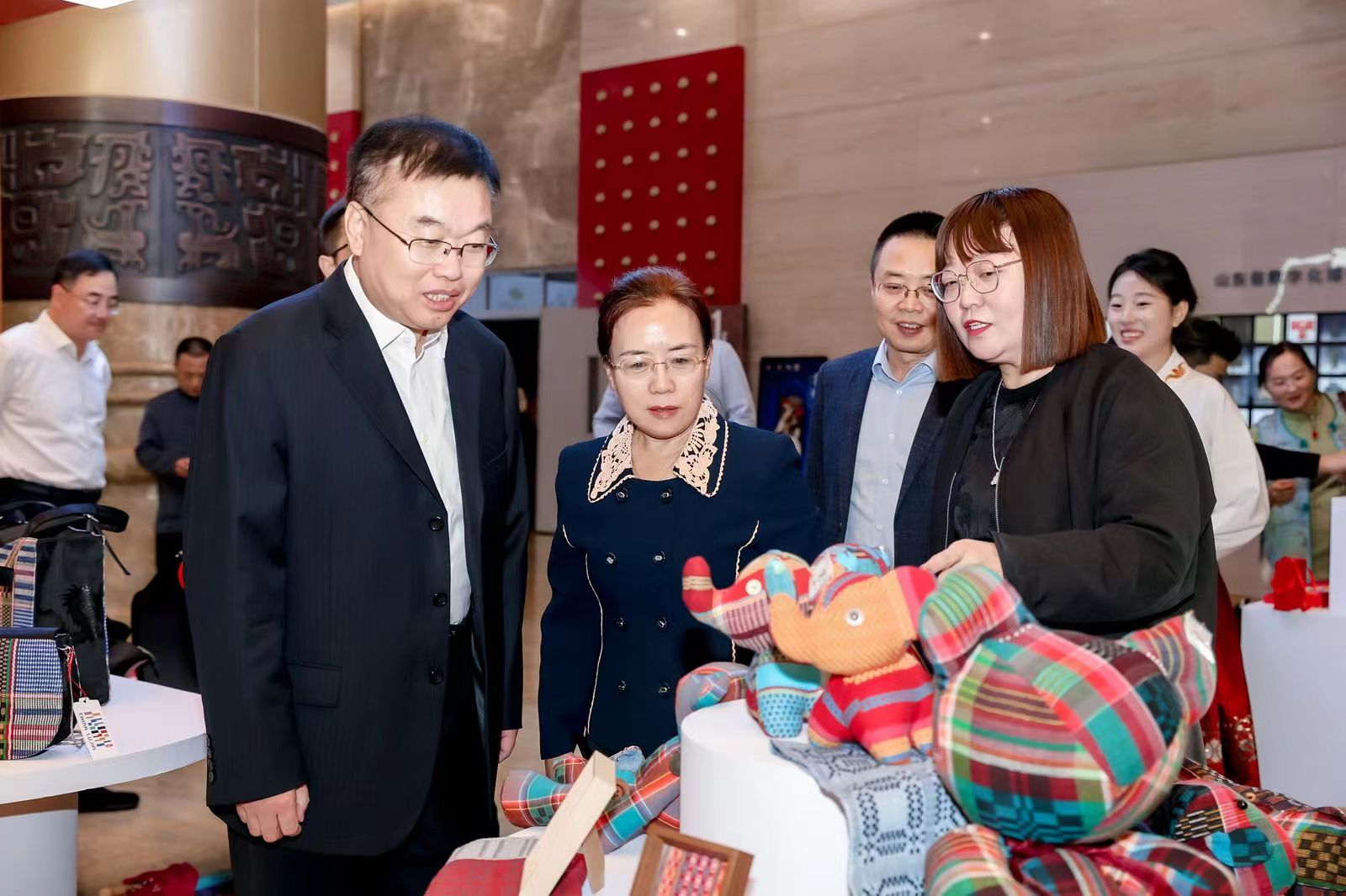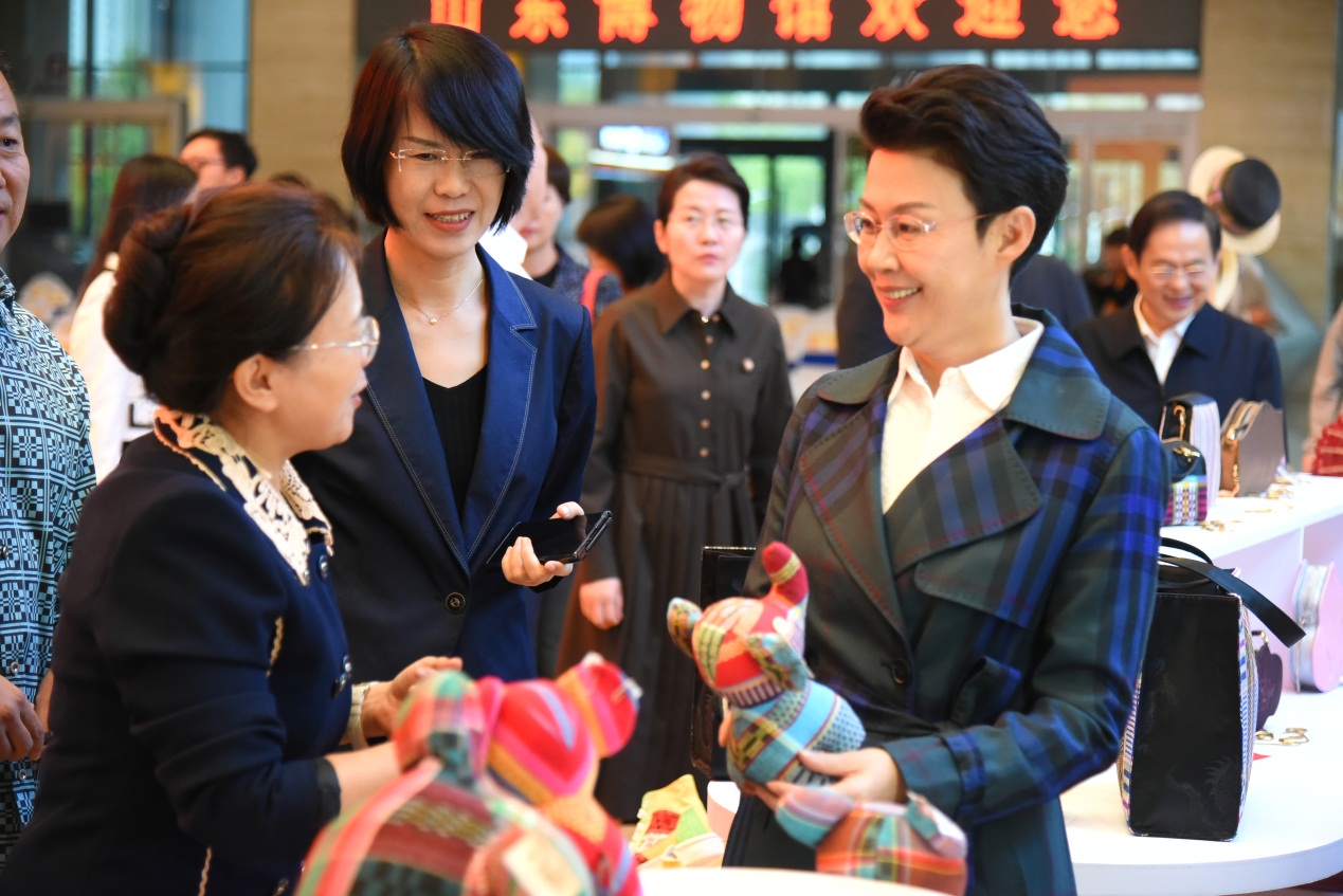 在Beat365官网产品展区,徐静向副省长王桂英等领导介绍了Beat365官网设计的系列鲁锦产品及鲁锦学院建设简况,得到省领导肯定。
