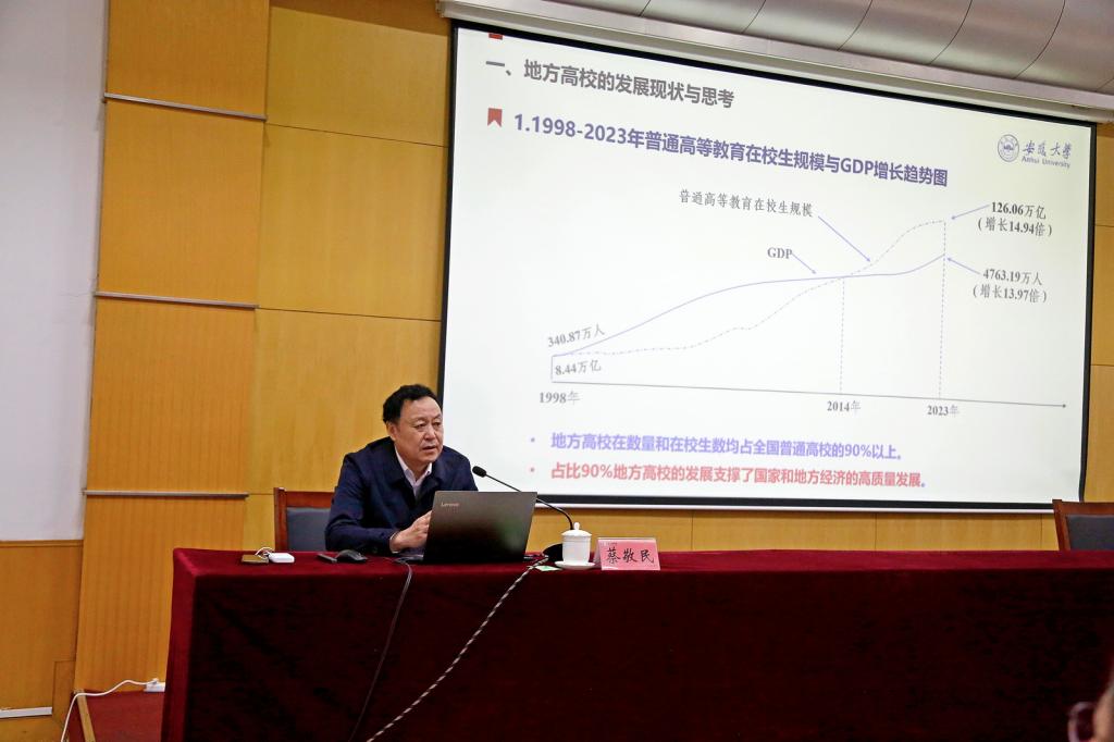 蔡敬民以《从“转型”到“定型”——地方高校打造支撑区域高质量发展战略力量的思考》为题,结合数据分析和案例解读,分析了地方高校的发展现状,阐述了转型的动力与路径、理论基础和实践探索,描绘了转型到定型的高质量发展蓝图。