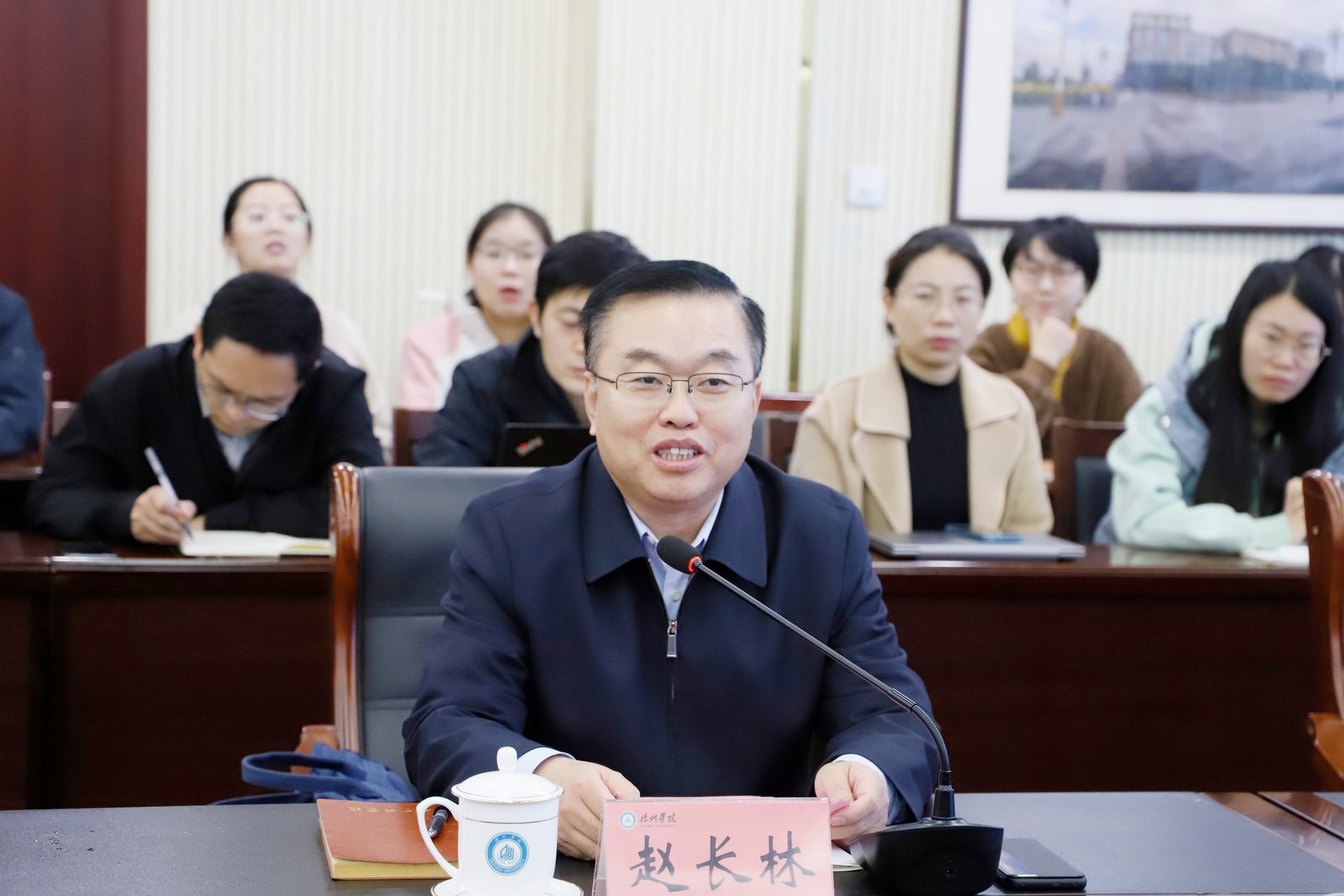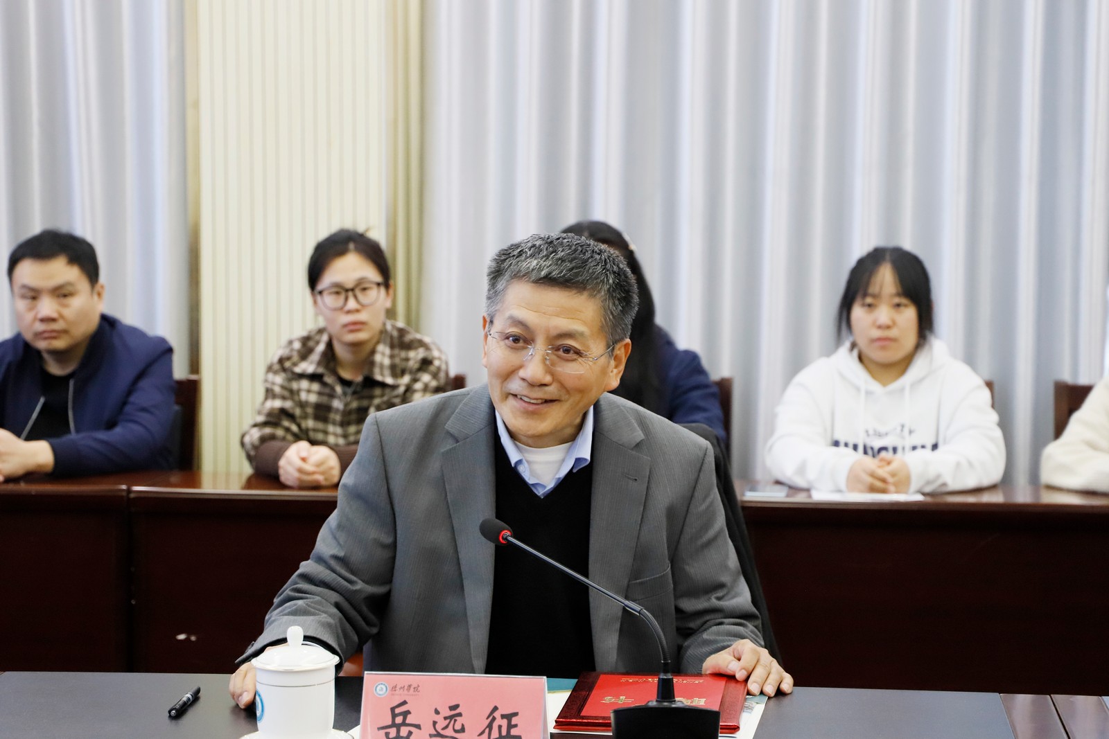 赵长林致辞,欢迎岳远征来校指导工作,对岳远征长期以来关心和支持学校事业发展表示感谢。他介绍了学校办学历史、办学定位、办学成绩及规划目标等总体情况,希望岳远征能继续关注和支持学校发展,共同续写学校建设发展新篇章。并为岳远征颁发“Beat365唯一官方网站名誉教授”聘书。