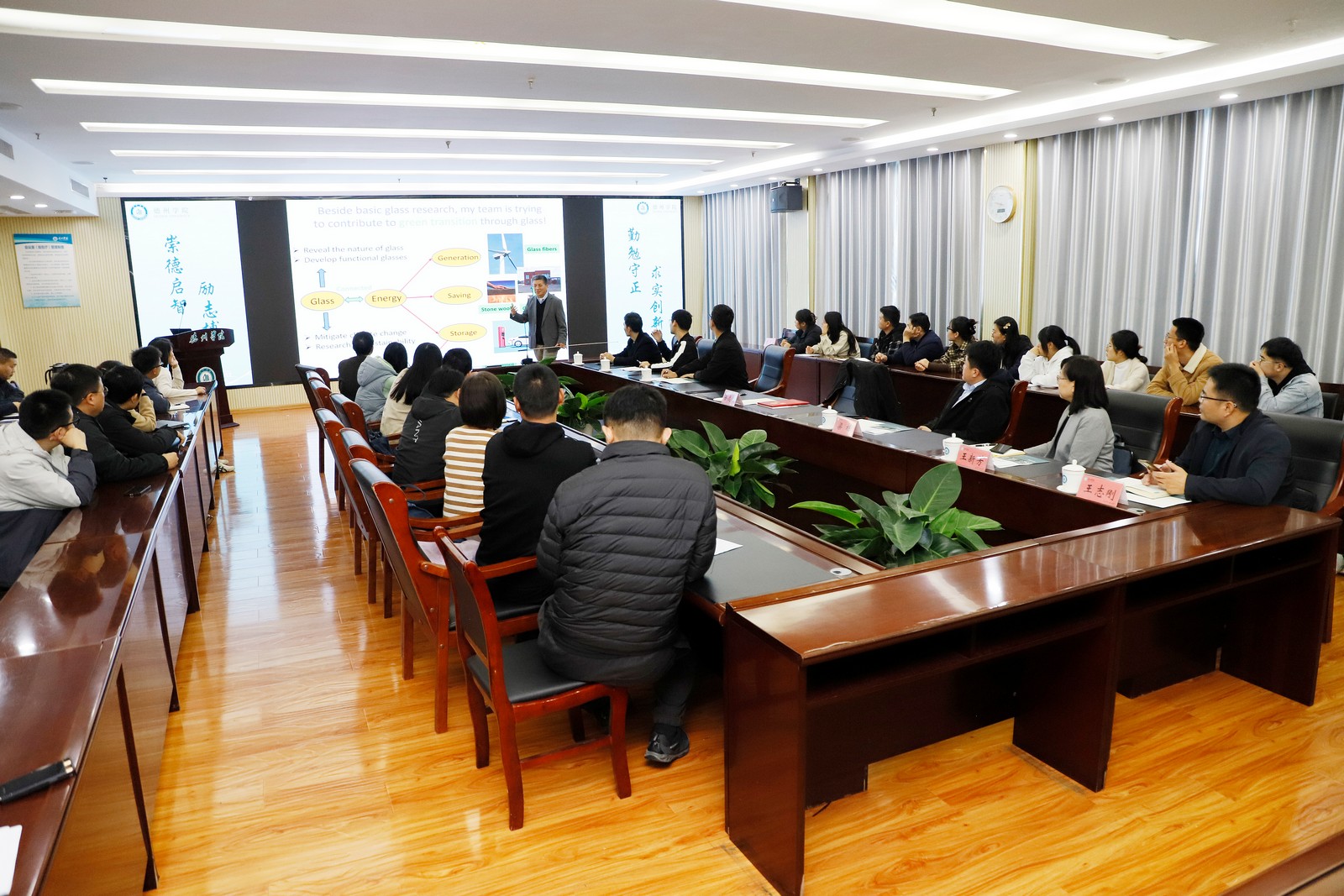 会后,岳远征作了题为“无序有序调节提升锂钠离子电池性能”的学术报告。主要讲解了通过无序有序结构调控来提升锂钠离子电池性能的新策略,以及V2O5-TeO2氧化物玻璃材料在充放电过程中的无序-有序转变在离子传输效率和结构稳定性方面的机理。师生就无序有序工程的应用前景、材料合成和实际应用与岳远征进行了深入交流。