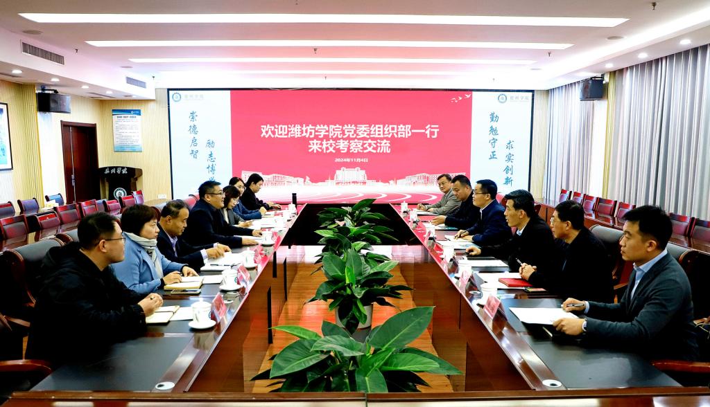 11月4日下午,潍坊学院党委委员、组织部部长赵加强一行来校考察交流,校党委副书记张存峰,党委委员、副校长单振涛会见赵加强一行,党委委员、组织部部长杨斌参加考察交流。