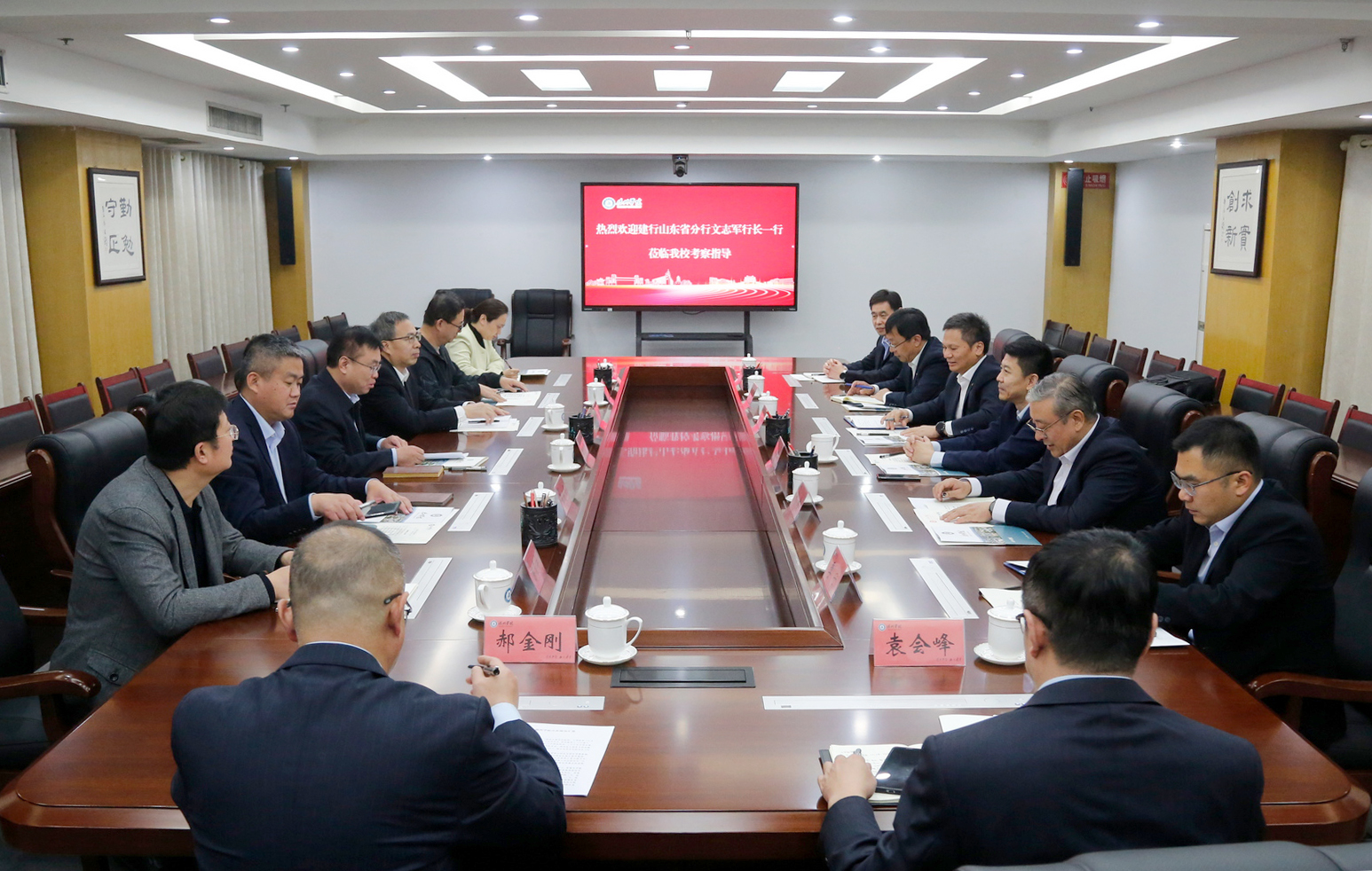 11月13日下午,中国建设银行山东省分行党委书记、行长文志军,党委副书记、副行长肖鹏一行来校调研交流。学校党委副书记、校长赵长林,党委委员、副校长刘印房会见文志军一行,双方就进一步加强银校合作进行深入交流。