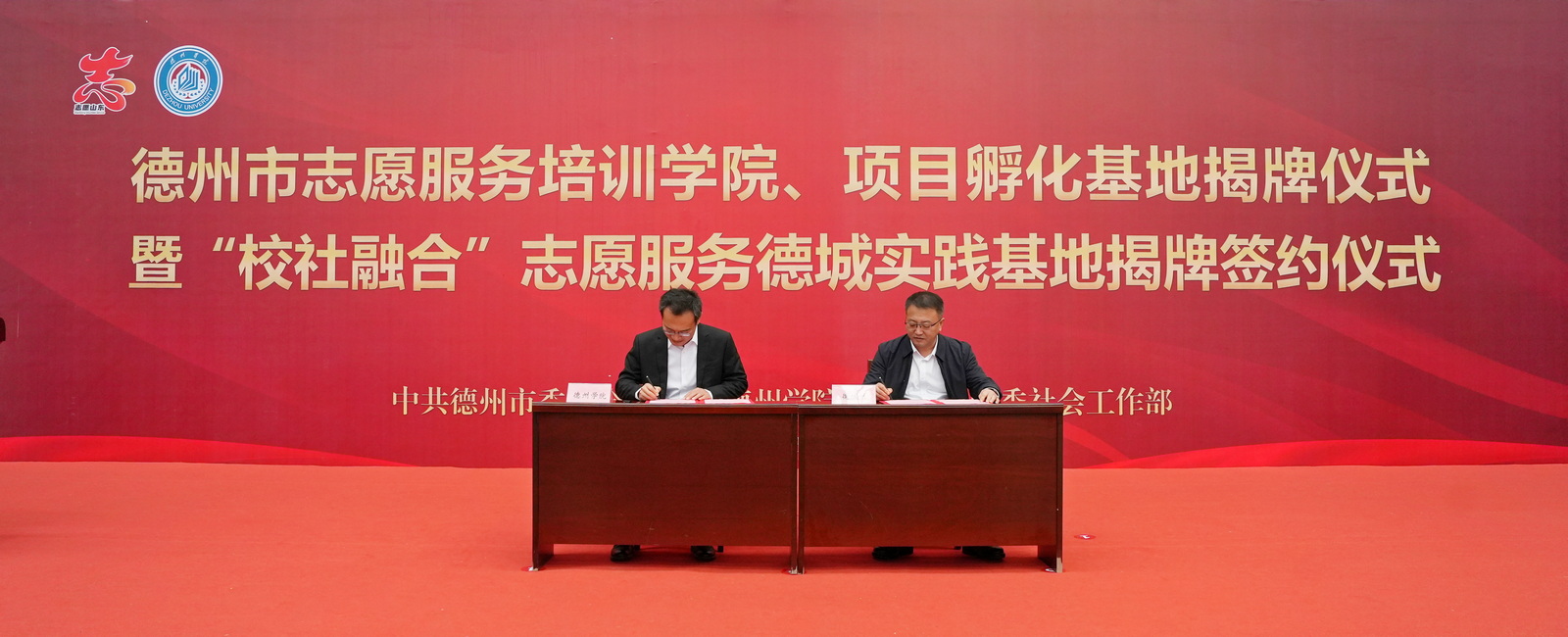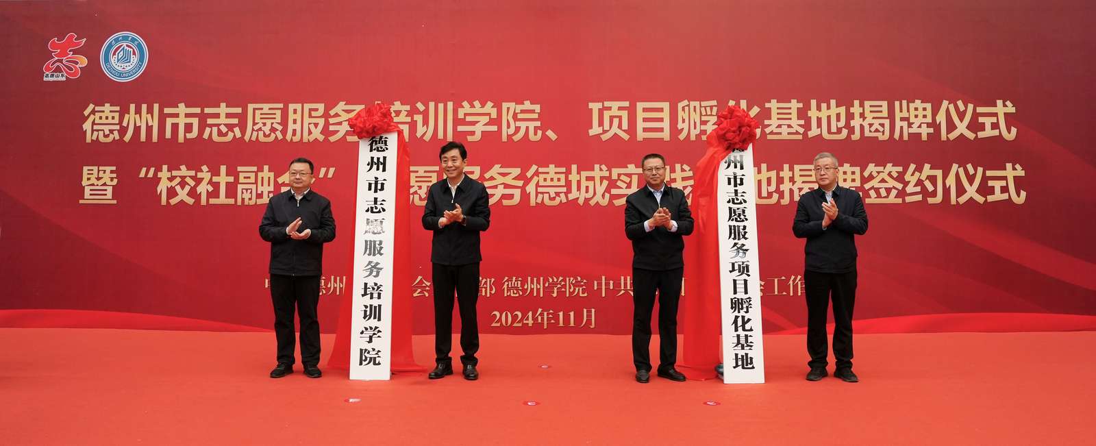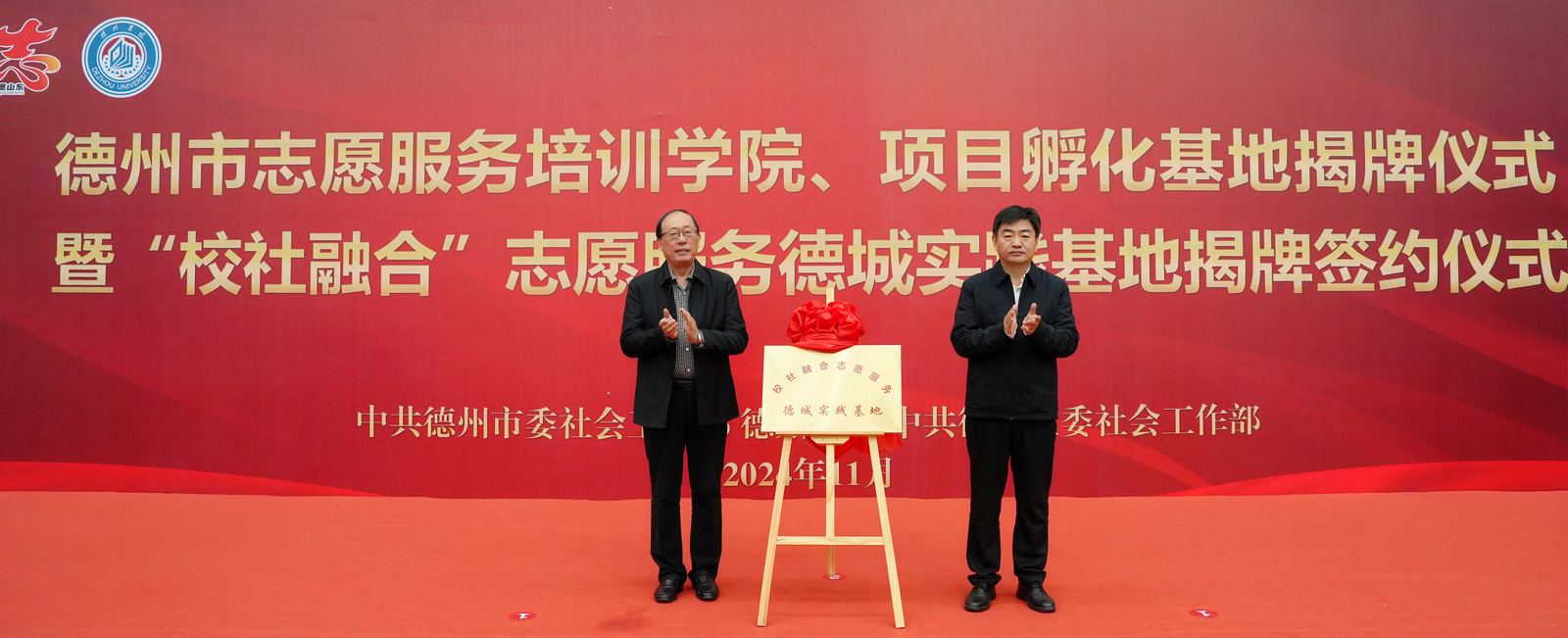 揭牌仪式上,马常春与邵浩浩、吴君与季之岭、张存峰与张因忠分别为“德州市志愿服务培训学院”“德州市志愿服务项目孵化基地”“校社融合”志愿服务德城实践基地揭牌。赵文彬与蒋涛涛为“校社融合”志愿服务德城实践基地项目签约。