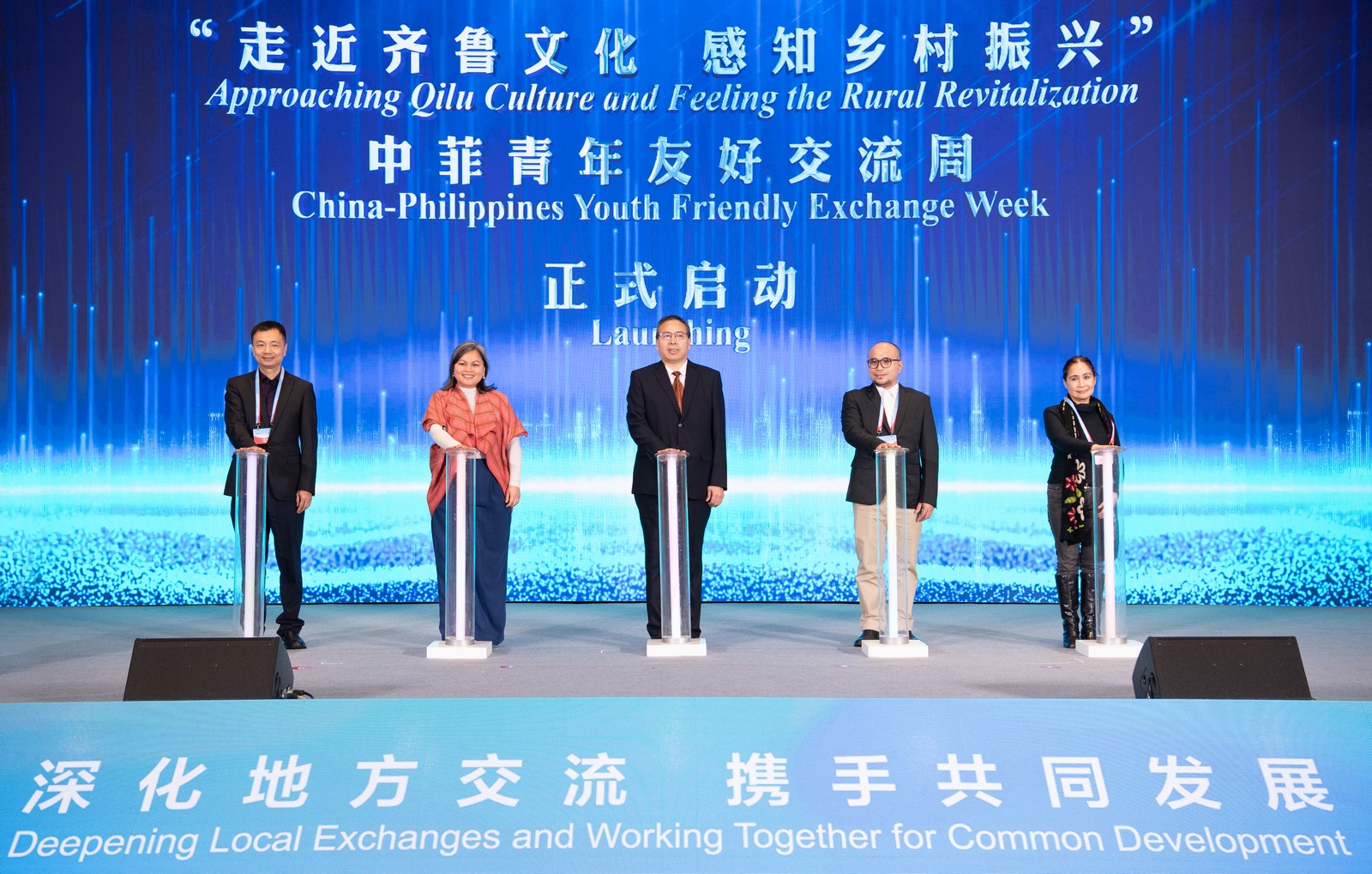 11月11日上午,在“2024黄河—湄公河交流周”开幕式上,党委委员、副校长刘印房,菲律宾驻华使馆三秘兼副领事法麻逸,北京大学外国语学院副院长吴杰伟教授,菲律宾大学玛利亚·维多利亚·拉奎萨教授,菲律宾马科斯国立大学梅尔文·巴格特教授共同启动“走近齐鲁文化 感知乡村振兴”中菲青年友好交流周活动。