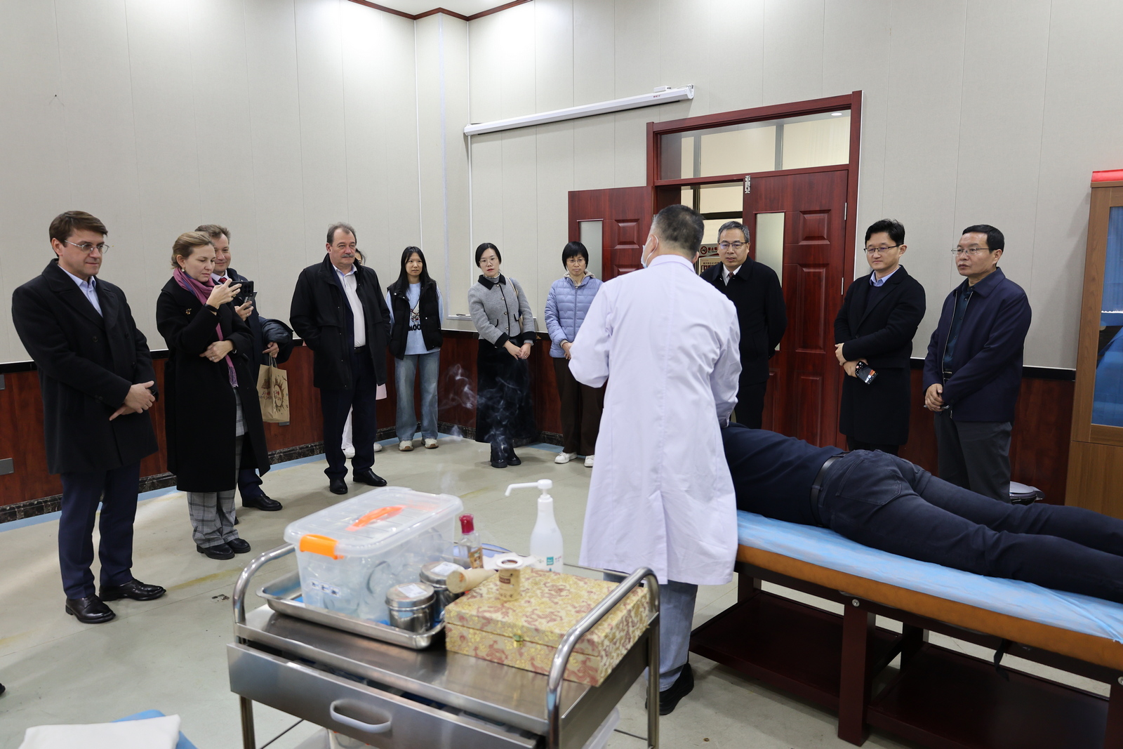 在德州市中医院,访问团一行参观了德州市中医健康教育基地,感知传统中医药文化的独特魅力,亲身体验针灸、推拿、拔罐、刮痧等传统中医康养项目,在经络疏通中感受“焕然一新”的中医养生功效和神奇。