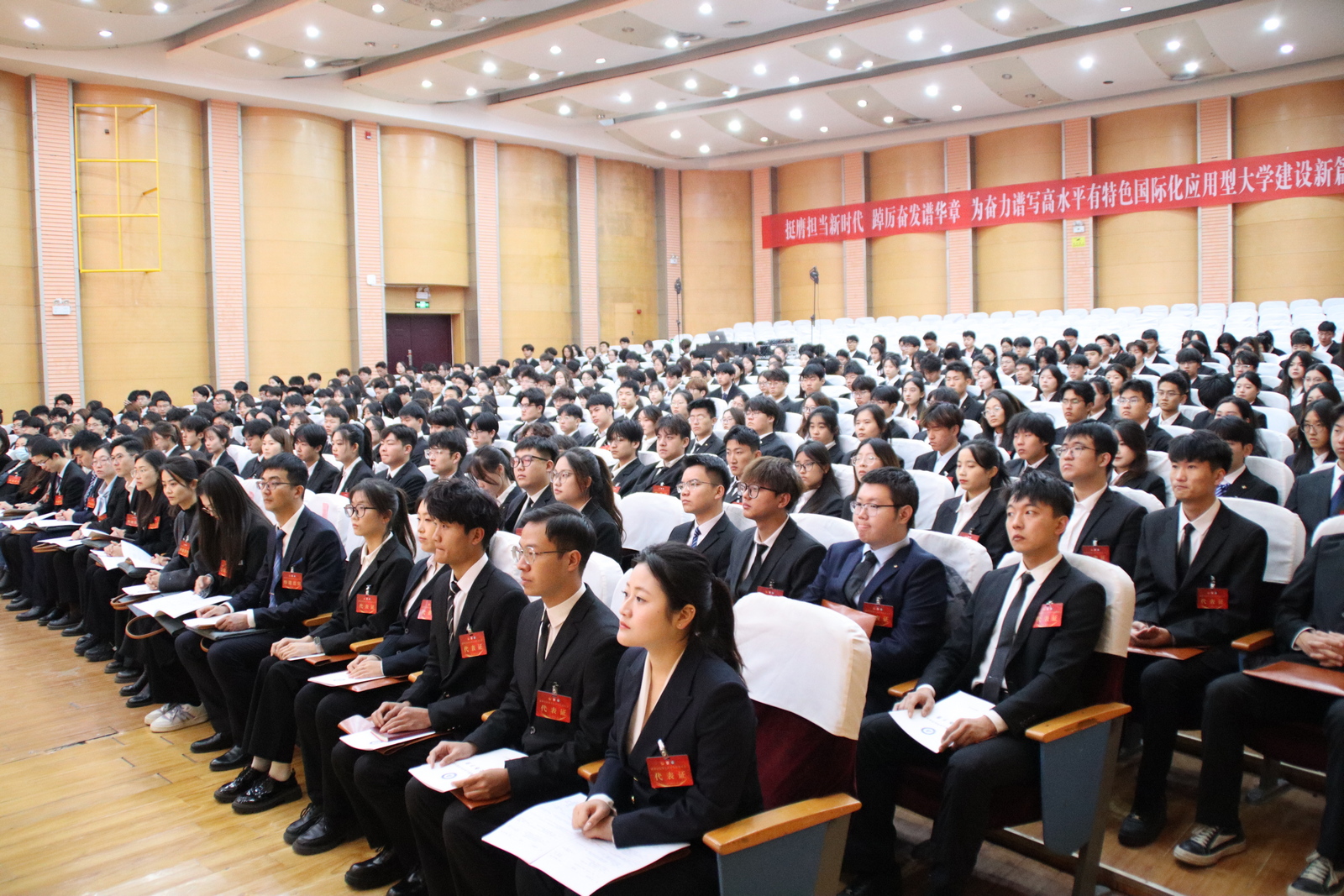 开幕会上,蒋涛涛代表学校党委对大会的胜利召开表示祝贺,对学校各级学生会组织在思想政治引领、志愿服务、权益维护、就业创业、社会实践、安全稳定、学校治理等方面作出的努力和成绩表示充分肯定,就下一步持续深化学生会组织改革提出了明确要求,并向学生会组织和广大青年学子提出三点希望:一要胸怀强国之志。要争做堪当民族复兴重任的时代新人,带头明大德、守公德、严私德,结合“大学生文明养成”专项行动、德州市文明城市创建和省文旅大会召开等重要时间节点,在实践历练中涵养家国情怀、砥砺奋斗精神,成为急难险重任务中一支靠得住的力量。二要锤炼强国本领。要自觉涵养“勤学善思,知行合一”的学风,主动对接国家、时代和社会需求,积极 参与到“百万大学生进社区”“青年实干家”等各类社会实践,以及正在开展的“AIGC青年创新创业行动”中,把潜在天分激发为持续的创造力,不断积累和磨炼应用型人才所具备的就业素质、社会能力和AI技能。三要追逐强国之梦。要主动围绕新时代新征程党的中心任务和学校重点任务,发挥只争朝夕的历史主动,常思考“青年何为”,积极在投身经济发展、科技创新、乡村振兴、民主法治、社会服务等方面发挥作用;常思考“青年何位”,积极在科技竞赛、创新创业、社会实践、志愿服务等方面强化责任,勇挑重担,在学校高水平有特色国际化应用型大学建设中挺膺担当。