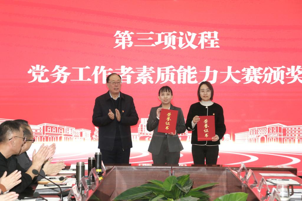 结业式上,校领导和相关部门负责人为联合功能型党支部和学生社区功能型党支部授牌,为学校首届党务工作者素质能力大赛获奖选手颁奖。