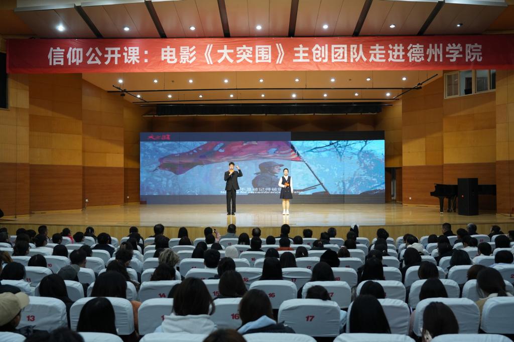 为贯彻落实教育部、省教育厅关于开展“传承红色基因、学思践悟中国共产党人精神谱系”宣传教育活动要求,12月9日下午,师生同上大思政课,挺膺担当共话信仰——电影《大突围》主创团队走进Beat365唯一官方网站。校党委副书记张存峰,党委委员、副校长蒋涛涛,党委委员、宣传部(教师工作部)部长冯琨,《大突围》出品人、总制片人陶姝君,导演杨真、演员廉知颖、副导演阿坤出席观影活动。