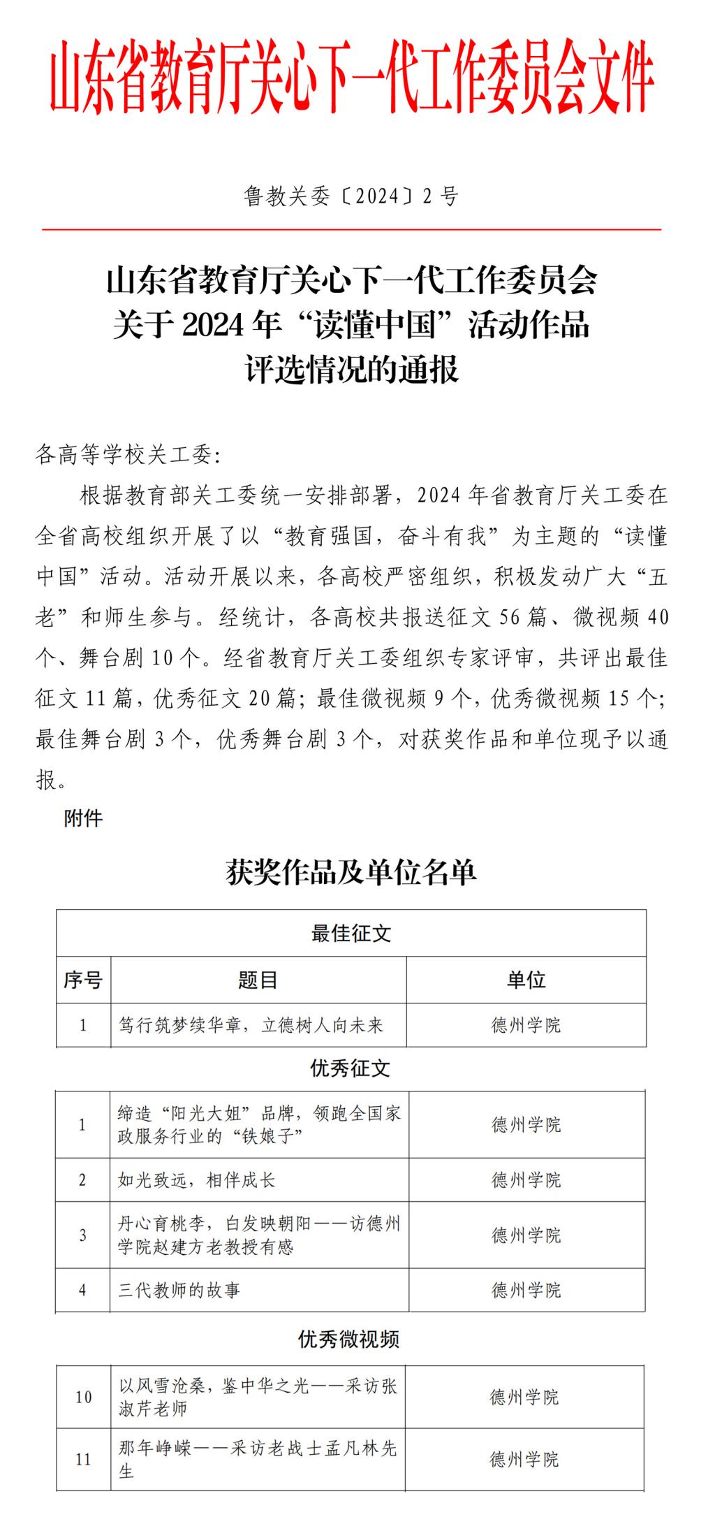 近日,省教育厅关工委下发了《山东省教育厅关心下一代工作委员会关于2024 年“读懂中国”活动作品评选情况的通报》(鲁教关委〔2024〕2 号),活动以“教育强国,奋斗有我”为主题,学校7件作品喜获通报。