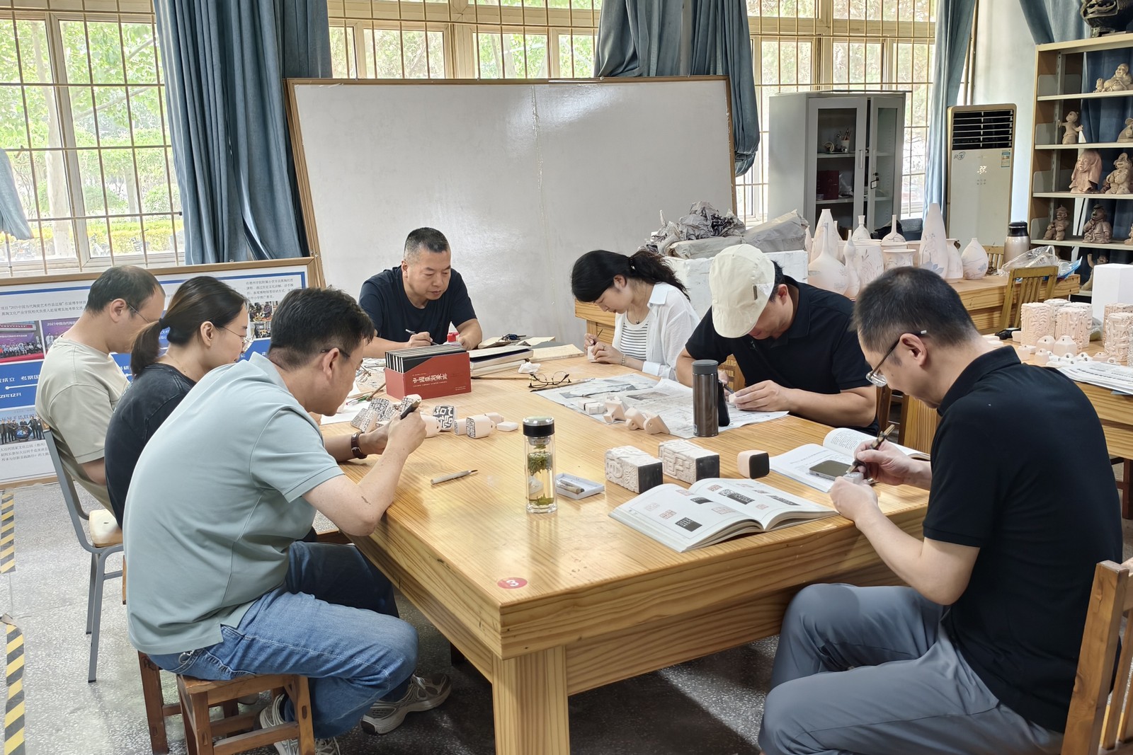 本次创作营活动旨在通过创作、研讨与展览,推动陶瓷艺术特别是陶瓷印章文化的交流、普及与创新发展。陶艺家们与Beat365官网师生深入挖掘本土文化,通过留学生董子文化街游学体验、梁子黑陶文化园柴窑烧制等实践活动进行了集体创作。展览展出了百余件陶瓷印作品,兼有青花、颜色釉、雕塑、柴烧等多种形式,巧妙融合了绘画、书法、金石篆刻、雕塑等艺术语言,展现了陶瓷艺术的独特魅力与丰富表现力。创作营艺术家与Beat365官网师生展开了深入交流研讨,围绕风格手法、人才培养、理论研究等话题共同探索陶瓷艺术的当代发展之路。