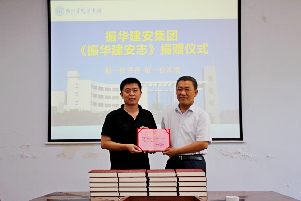德州振华建安集团有限公司执行总裁张光栋代表振华建安集团捐赠《振华建安志》30册,张明征代表学校接受了捐赠,并向张光栋颁发捐赠证书。《振华建安志》共计80余万字,历时两年完成编纂并出版,浓缩了该企业40余年的奋斗史和文化史,全面、真实、系统地记述了企业跟随时代发展变迁,由小变大、由弱变强、由单一变多元的发展历程。