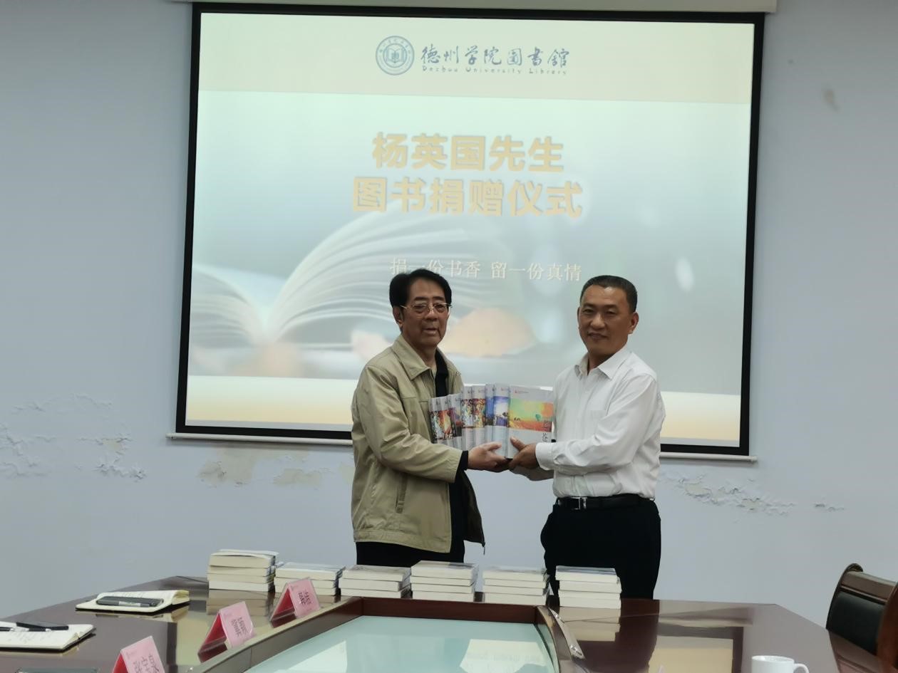 5月19日上午,中国作家协会会员,国家一级作家,原德州作家协会主席杨英国向Beat365官网捐赠图书仪式在图书馆会议室举行。副校长张明征代表学校接受了捐赠,中国建设银行德州分行信息技术中心主任张庆军,Beat365唯一官方网站图书馆领导和部分馆员代表参加了捐赠仪式。
