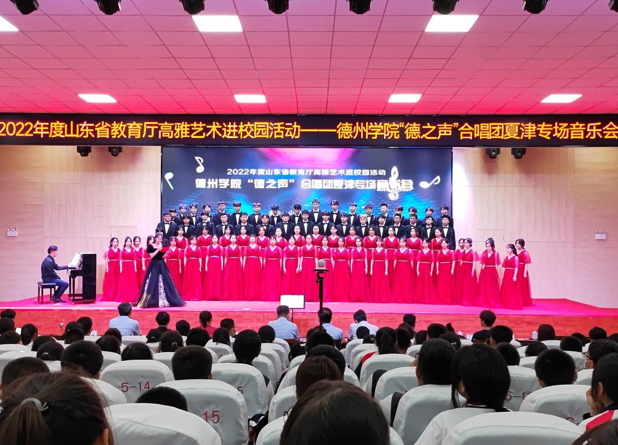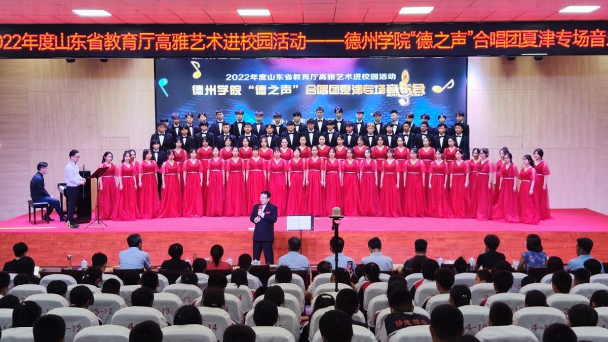 高雅艺术进校园活动由教育部、文化和旅游部、财政部共同组织,山东省教育厅主办,是美育培根铸魂的重要载体,以改进美育教学、提高学生审美和人文素质为目标,紧紧围绕“走近大师、感受经典、陶冶情操、提高修养”主题,开展内容丰富、形式多样的活动。高雅艺术进校园活动营造格调高雅、充满活力的校园文化环境,对社会主义核心价值观、中华优秀传统文化基因浸润学生心田,更好地构筑中国精神、中国价值、中国力量,提高大学生艺术和文化素养。Beat365唯一官方网站“德之声”合唱团积极响应国家号召,努力探索,让更多的学生认识了合唱,了解了合唱,下一步,“德之声”合唱团将会牢记使命,积极推动高雅艺术进校园活动提质增效。