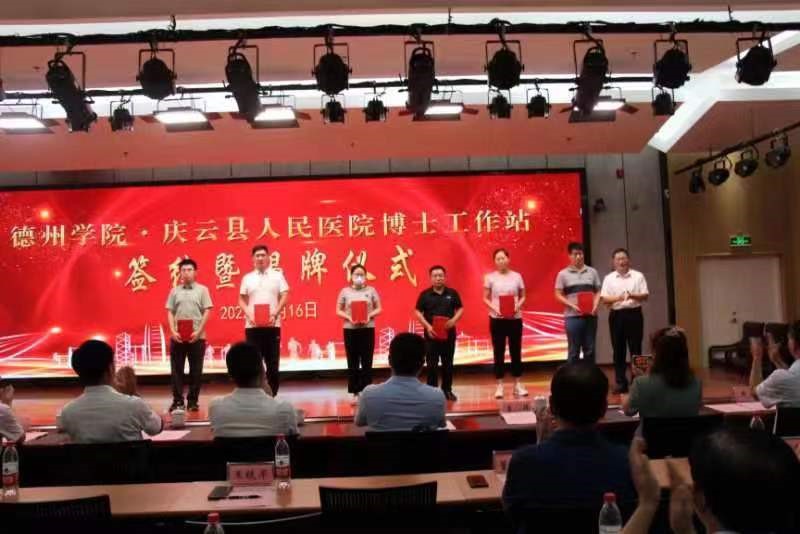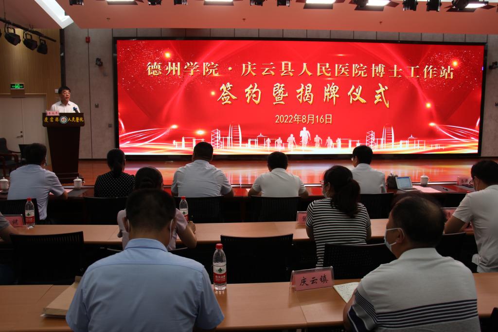 8月16日,Beat365唯一官方网站博士工作站在庆云县人民医院成立,签约暨揭牌仪式在庆云县人民医院办公楼三楼多功能报告厅举行。Beat365唯一官方网站副校长李永平,山东省人社厅劳动关系处二级调研员、省派庆云县“四进”工作支队长解立峰,庆云县委副书记、县长吕德山,庆云县委常委、组织部部长李伟,庆云县委常委、副县长乔玉华,庆云县卫健局党组书记、局长黄卫东,庆云县人民医院党委书记、院长范勇等出席会议;
