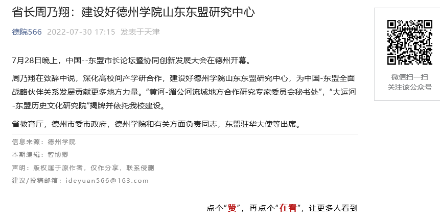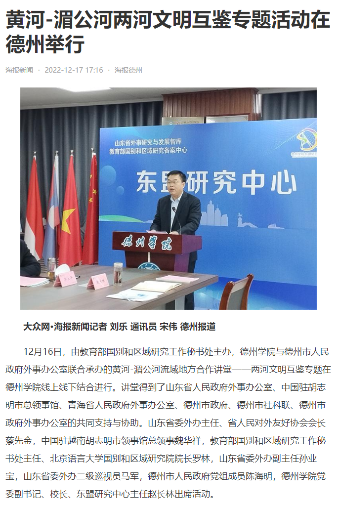 为深入贯彻落实习近平总书记关于黄河流域生态保护和高质量发展的重要论述以及构建更为紧密的中国-东盟命运共同体的要求,在省委外办指导下,与德州市外办联合,先后举办“黄河-湄公河流域地方合作系列讲堂”柬埔寨专题,企业专题,老挝专题,两河文明互鉴专题活动。被人民日报客户端、中国-东盟中心官微、国际在线、中国山东网、 感知山东、大众网,闪电新闻等多家新闻媒体报道。