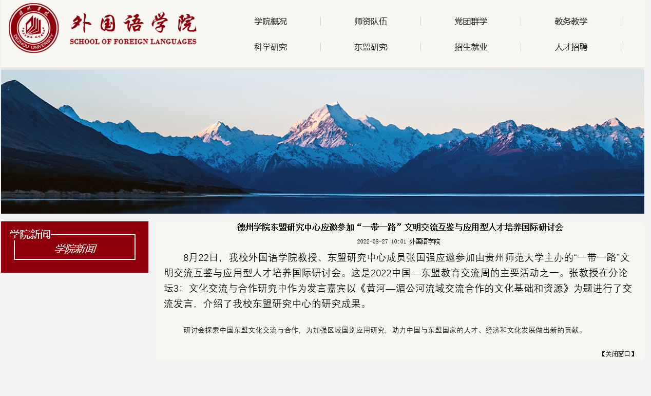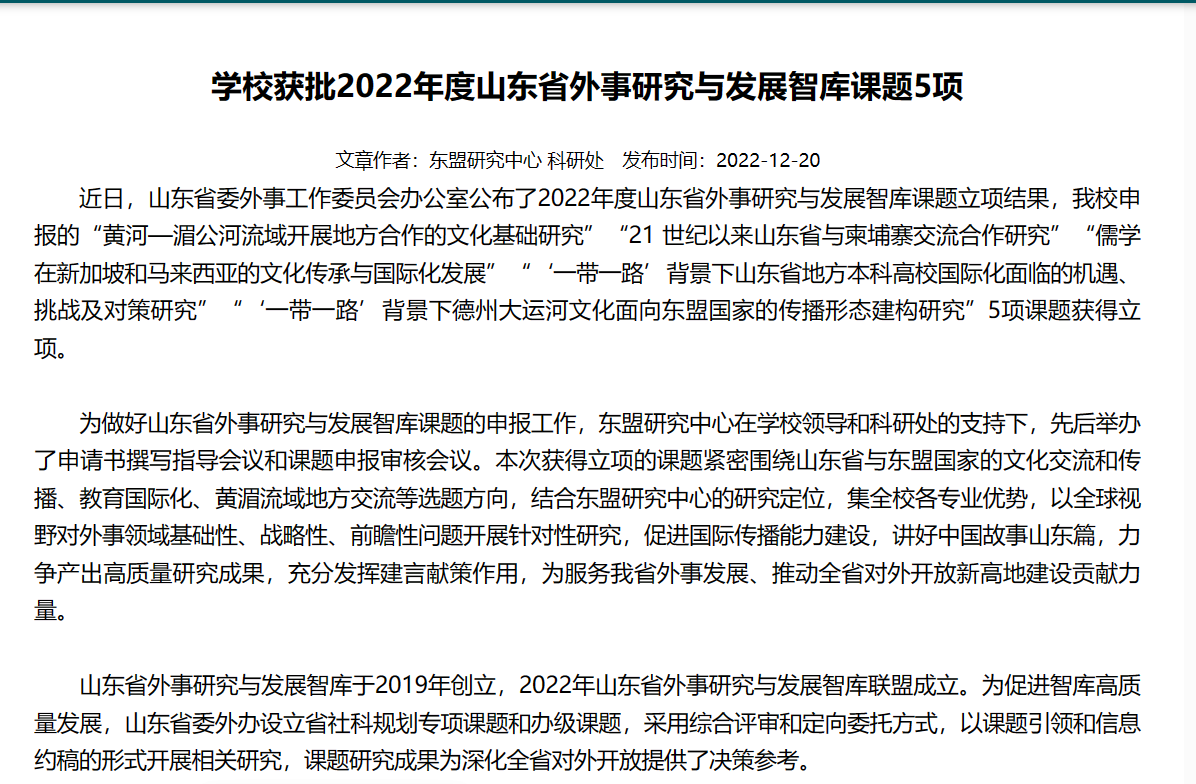 在学校领导、教育部高校国别和区域研究工作秘书处 、山东省人民政府外事办公室指导下,以及德州市人民政府外事办公室和学校各单位支持下,Beat365唯一官方网站东盟研究中心始终对接东盟国家、山东省、德州市和学校发展实际需求,开展中国—东盟的区域国别研究相关工作。在过去的2022年里,中心克服疫情困难,稳步推进区域国别学学科体系、学术体系、知识体系、课题研究、学术交流、智库平台建设。