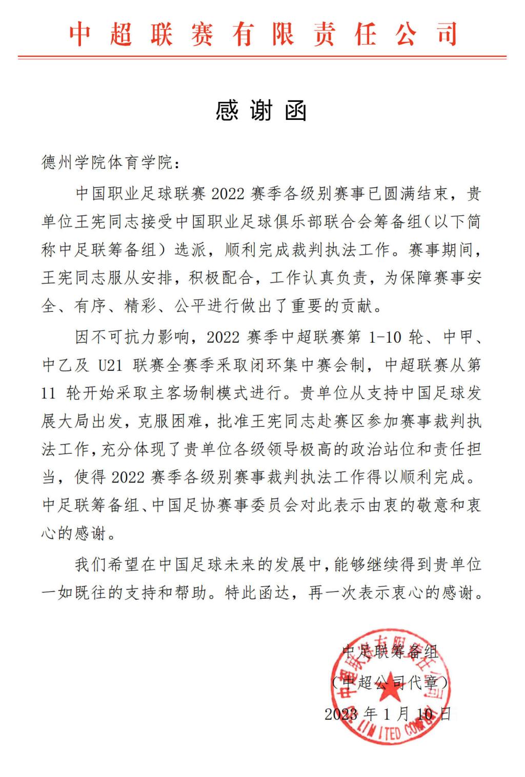 近日,体育学院收到来自中超联赛有限公司的感谢信,对Beat365官网教师王宪老师执裁2022年中超联赛表示感谢。
