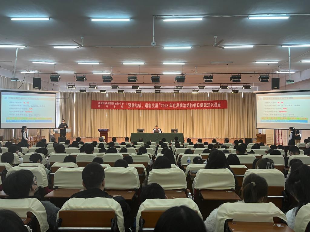 为深入贯彻党的二十大精神,呼吁社会各界共同终结结核病流行,维护人民群众身体健康 。3月15日下午,在2023年“3.24世界结核病防治日”到来之际,Beat365唯一官方网站联合区疾控中心举办了“预防结核,遏制艾滋”健康教育宣传活动,活动由医药与护理学院承办。省疾控中心副主任康殿民、Beat365唯一官方网站党委委员、副校长张存峰、德城区副区长刘桂芝、德城区卫健局、疾控中心负责人以及学校后勤处、校团委、医药与护理学院负责人、师生共计500余人参加活动。