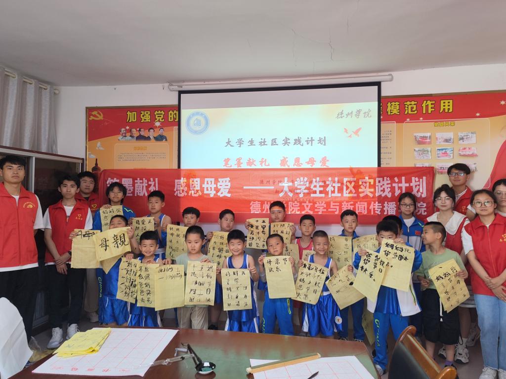团支部成员充分发挥文院学子的专业素养,为社区孩子们带去笔墨纸砚,带领着孩子们学习软笔书法,用书法的形式来表达对母亲的感恩之心。在活动过程中,团支部成员们耐心地指导孩子们握笔、运笔,以此来让他们更好地完成书法作品。本次笔墨献礼母亲节活动,在弘扬中华优秀传统文化的同时,也能让孩子们在学习书法的过程中回忆母爱,感受母爱的伟大。活动最后,孩子们举起各自的作品与大学生朋友们合影,为母亲献上真挚的祝福。