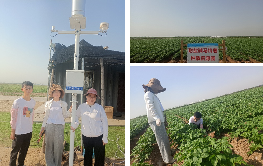 在希森马铃薯集团盐碱地试验基地工作人员的协助下,团队成员在“耐盐碱马铃薯品种筛选”中度盐碱地试验地完成了微气象站的安装工作,该微气象站可以监测土壤温湿度、土壤电导率、太阳辐射、气温等环境指标,用以开展马铃薯田间管理优化研究。另外,团队成员完成了盐碱地马铃薯株系、根际土壤和非根际土壤取样等实验。