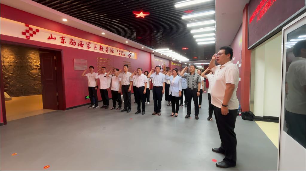 在山东渤海军区教导旅革命传统教育基地,全体党员面对展区宣誓墙,重温入党誓词并庄严宣誓,表达对党的忠诚与信仰。随后,在讲解员带领下,大家先后参观了该基地的“渤海建军 守卫家园”“战旗西指 铁血万里”“铸剑为犁 屯垦戍边”“英载史册 精神不朽”四个部分,大量生动详实、珍贵的史料,真实地记录了老一辈革命家浴血奋战、不畏牺牲的英雄壮举。大家驻足凝望,用心感悟“大义大爱、无私奉献、听党指挥、永葆信念”的山东渤海军区教导旅精神。