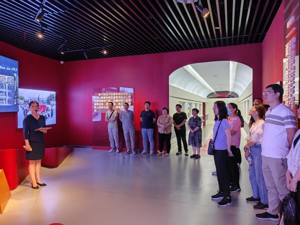 齐河党员教育体验基地内,讲解员带领大家参观不同主题的展厅,生动、鲜活地讲述着党史和人物故事。跟随讲解员的讲解,大家循着一幅幅照片、一件件展品,一幕幕场景,重温革命年代、奋进时代场景,进一步学习革命先辈的大无畏奉献精神,感受优秀共产党员立足岗位敢于担当、勇于奉献的宝贵品格。全体人员通过现场聆听讲解和情景式体验,接受了一次党性教育和党性锻炼。参观结束,大家在党旗面前庄严宣誓,重温入党誓词,在党旗下接受心灵的净化和洗礼。