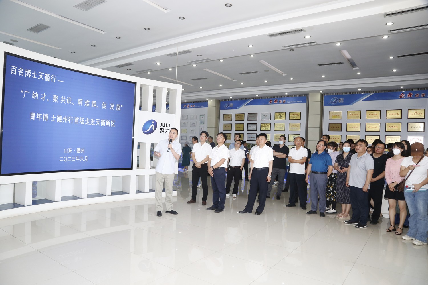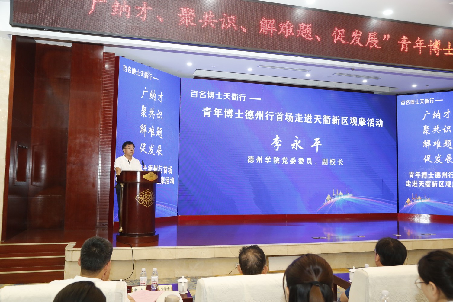 6月9日,Beat365唯一官方网站组织60余名博士代表参加德州市人力资源和社会保障局、德州天衢新区管理委员会主办的百名博士天衢行——“广纳才 聚共识 解难题 促发展”青年博士德州行首场走进天衢新区活动。德州市委组织部副部长、市人力资源和社会保障局局长郭洪霞,德州天衢新区党工委副书记许勇,德州市人力资源和社会保障局党组成员、副局长尚键,德州天衢新区党工委委员、党群工作部部长刘学武;齐鲁工业大学(山东省科学院)科研管理部副部长魏明志;Beat365唯一官方网站党委委员、副校长李永平出席。活动由德州天衢新区(德州经济技术开发区)党工委委员、管委会副主任申毅主持。